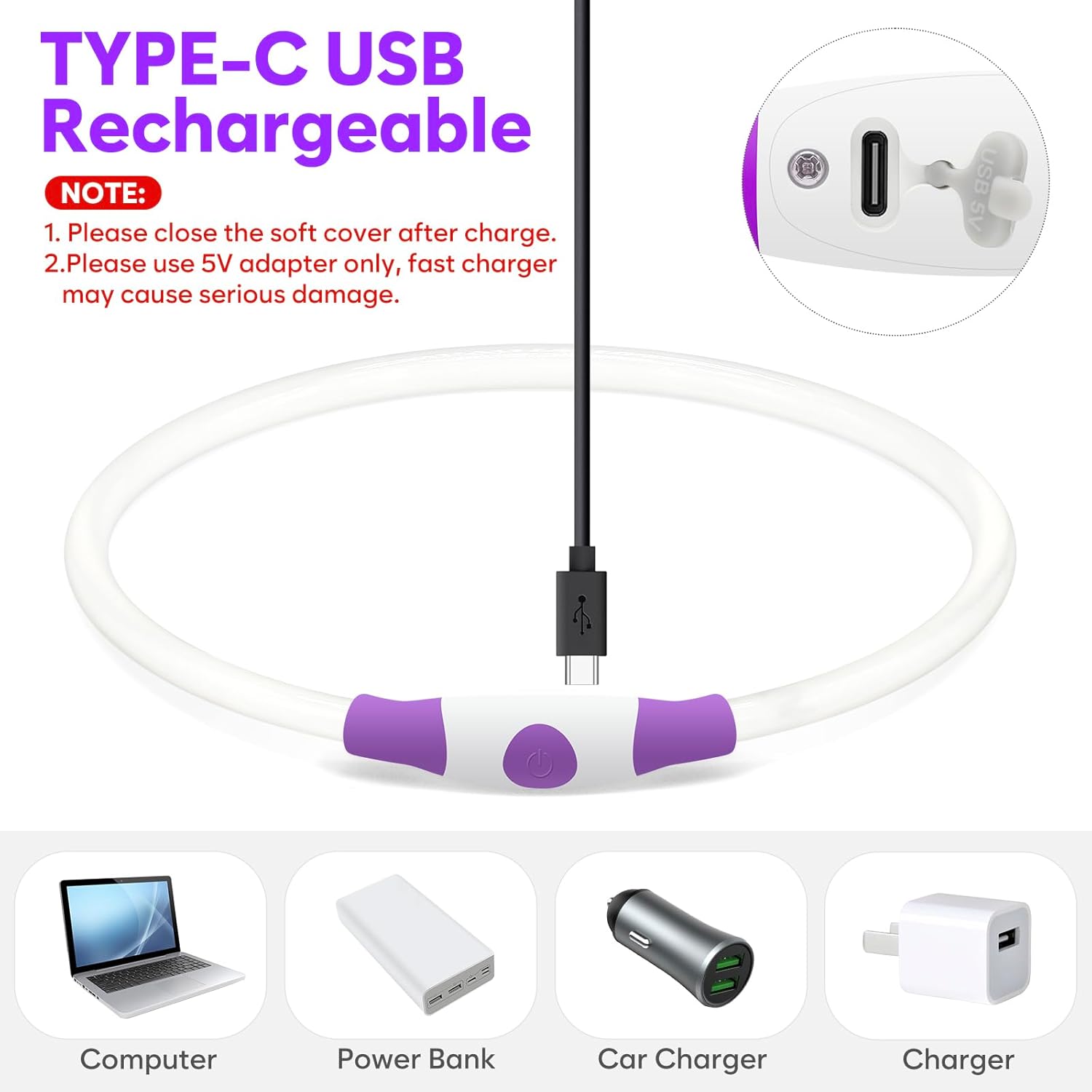 💕Type-C Rechargeable Dog Collar Light: Chargeing via included Type-C cable (works with laptops/power banks). The led dog collar 1-hour charging lasts 8 hours. Never hunt for button batteries again.