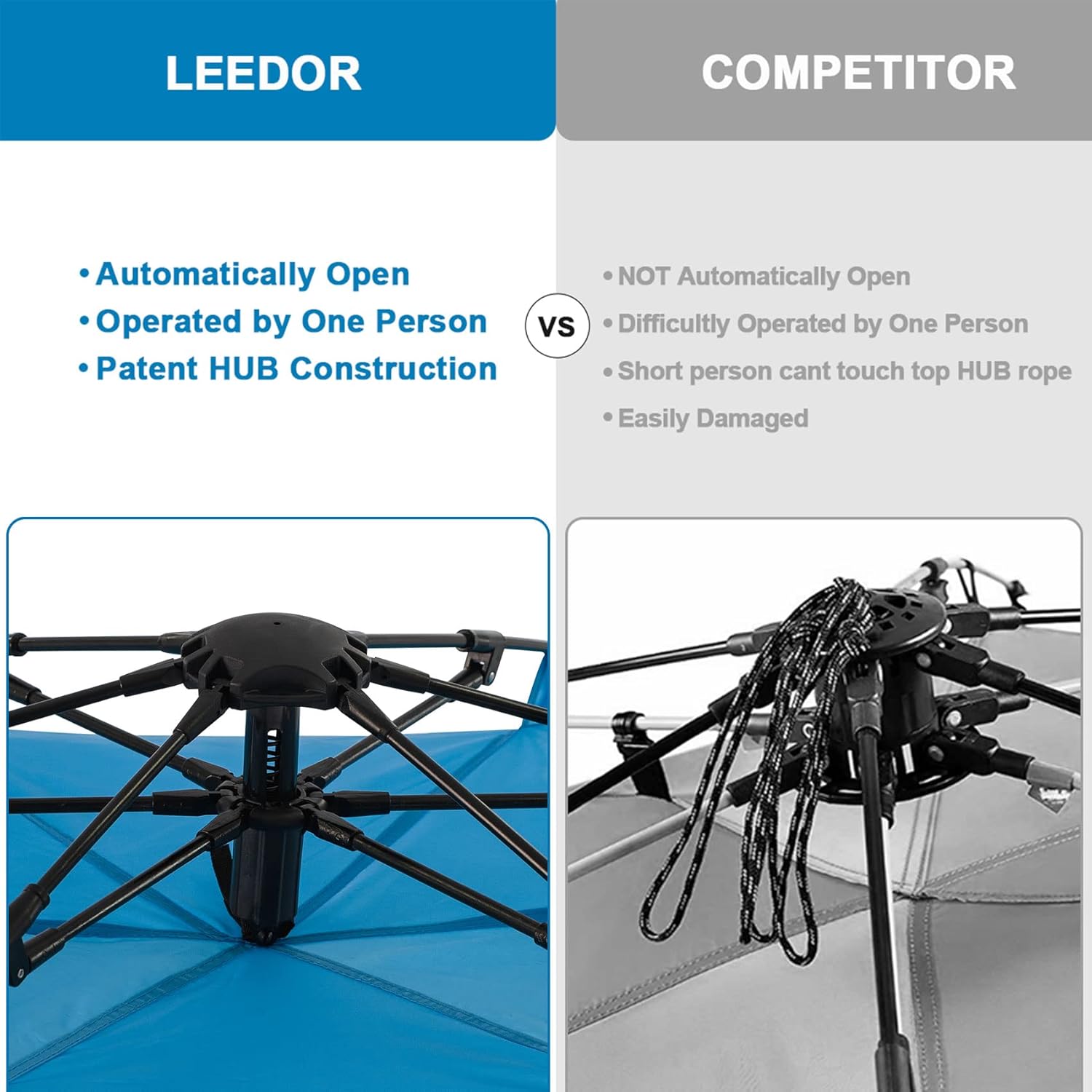 New Version: Extra large beach tent with a extended floor, providing a good place to rest and playing games. You can also hang it on the front porch and use it as a dressing room for convenience and privacy. POP UP automatically in a second. Upgrade stronger and larger HUB connector and fiberglass make this sun shelter more stable and durable. Compared to other sun shade use drawstrings, this sun shelter create a cool space for your family without any effort. Super easy up and down.