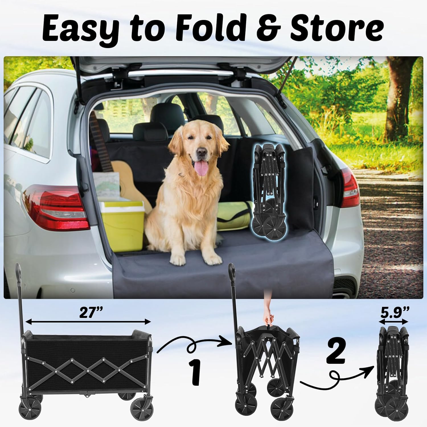 1-Second Fold & Ultra-Light: Collapsing wagon cart with wheels foldable (unfolded: 27″L x 17.3″W x 46.5″H, the length almost equal to the width of a standard door) into a compact collapsible wagon with wheels (5.9″L x 17.3″W x 18.9″H) in just 2 simple steps – folding down to about 80% smaller than bulky wagons carts. Fits perfectly in car trunks, apartment corners, or even your closets. At only 11 lbs (about the weight of a small dog), this compact portable wagons collapsible is easy to carry one-handed, perfect for camping, travel, shopping, or beach trips.