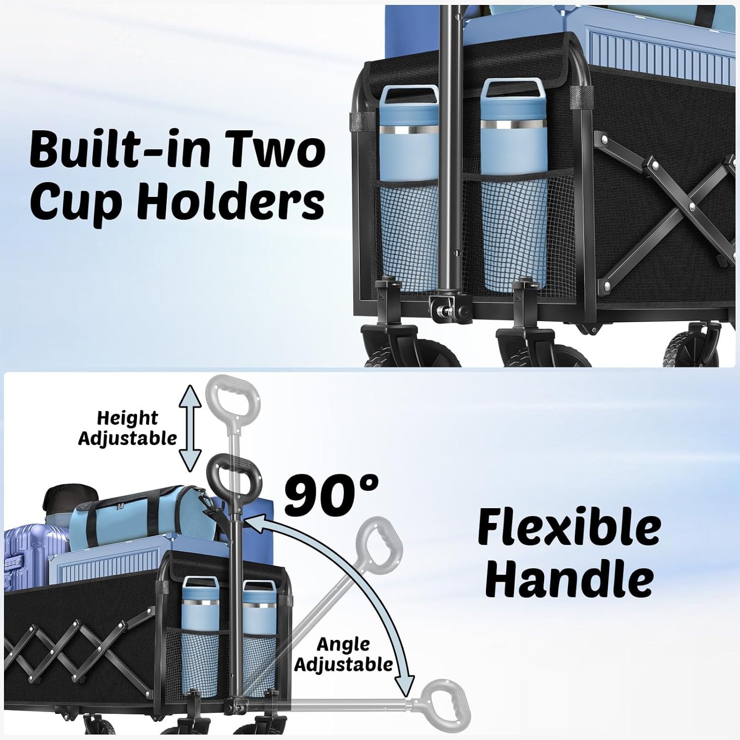 Adjustable Handle & Built-In Cup Holder: Unlike fixed-handle sports wagon collapsible heavy duty, our adjustable drawbar of the collapsible folding wagon ensures smooth pulling for family members – from children to seniors. While the attached drink pocket keeps your beverage secure. The foldable wagon cart is perfect for picnics, sporting events and outdoor adventures with your family