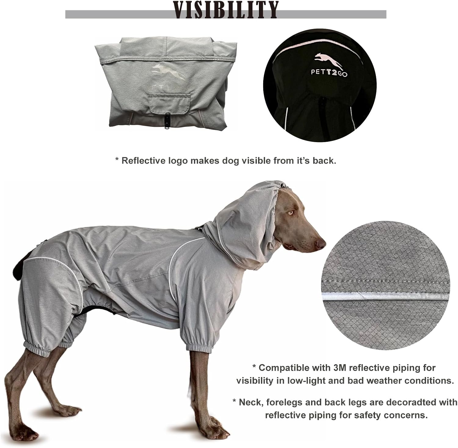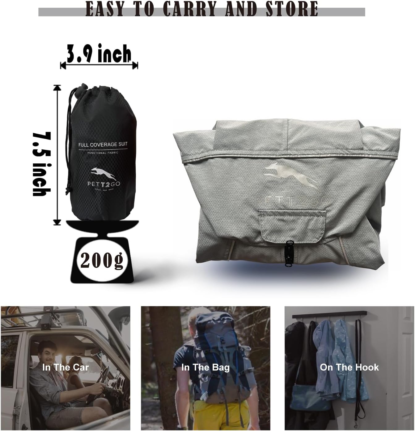 Fullcoverage suit doesn’t restrain dog’s movement, adjustable cord can fix hood to protect dog’s ears and neck during bad weather.