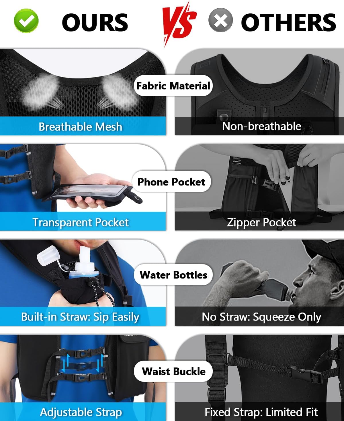 Hydrate on the Run – Our upgraded running hydration vest comes with a 500ml BPA-free soft flask, now equipped with a convenient straw tip for effortless drinking. No squeezing required—enjoy smooth, hands-free hydration so you can stay focused on your run. The elastic drawstring keeps the flask securely in place to prevent bouncing, making it ideal for marathons, trail running, and long-distance adventures.