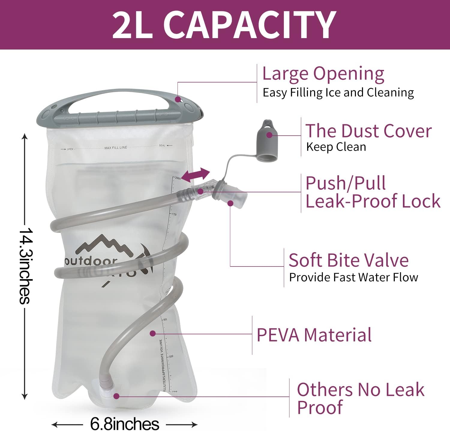 🚴【Premium Quality Water Bladder】The Hydration Pack Backpack comes with a 2 liter hydration water bladder. A switch valve and a cover cap make double leak-proof. Large opening allows quick filling of water and ice and it is easy to clean, the water line (40″length,0.4″diameter) provides a wholesome flow for easy drinking keeps your water tasting fresh, all day. The water temperature is range -20~+50℃.