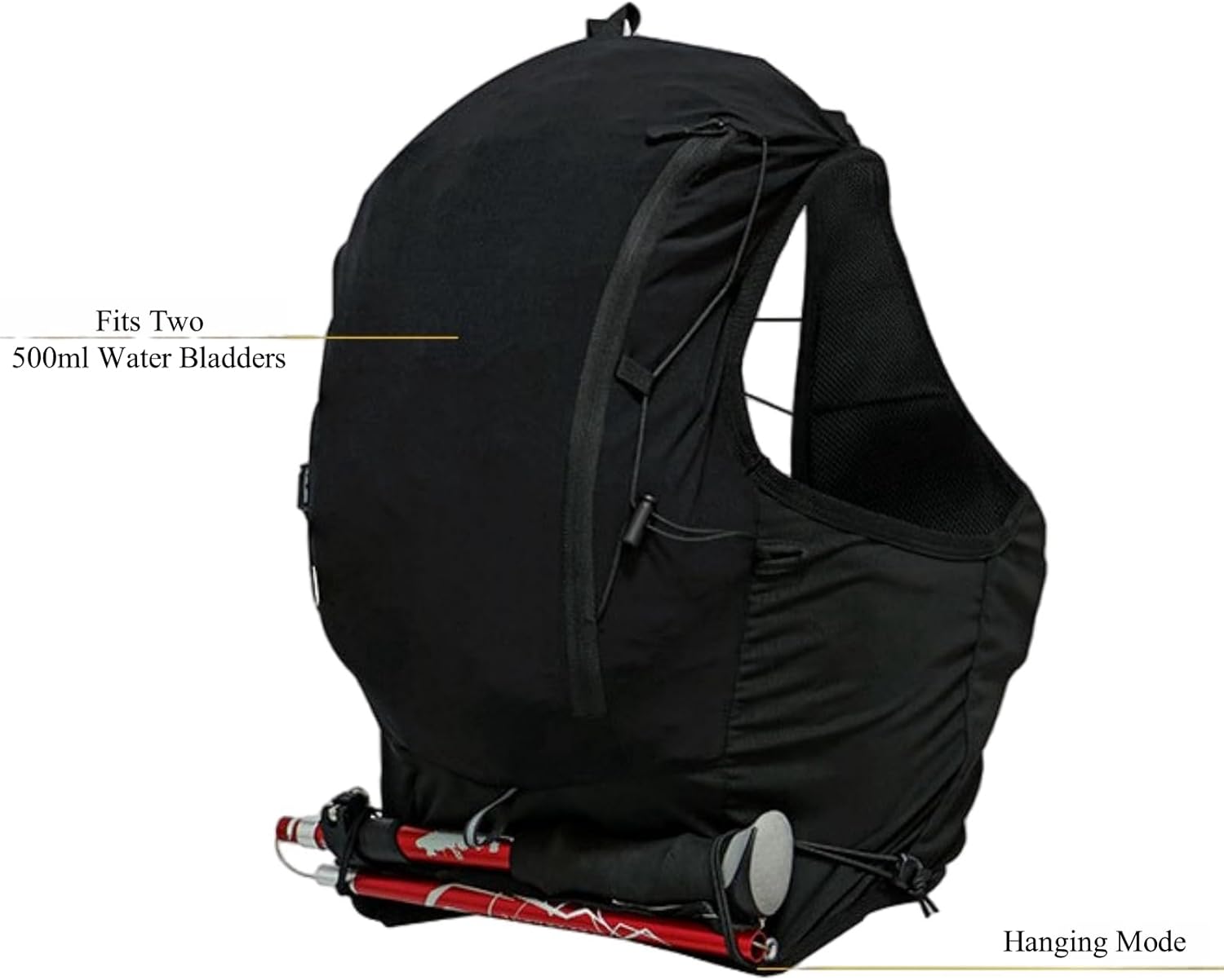 Quick-Access Front Storage & Dedicated Hydration Gear Storage: Features 2 phone pockets, 2 water bottle holders, and 2 energy gel pockets for on-the-go fueling. Back compartment fits two 500ml water bladders ( Not included ), a 5L zippered pocket for jackets, snacks, or accessories