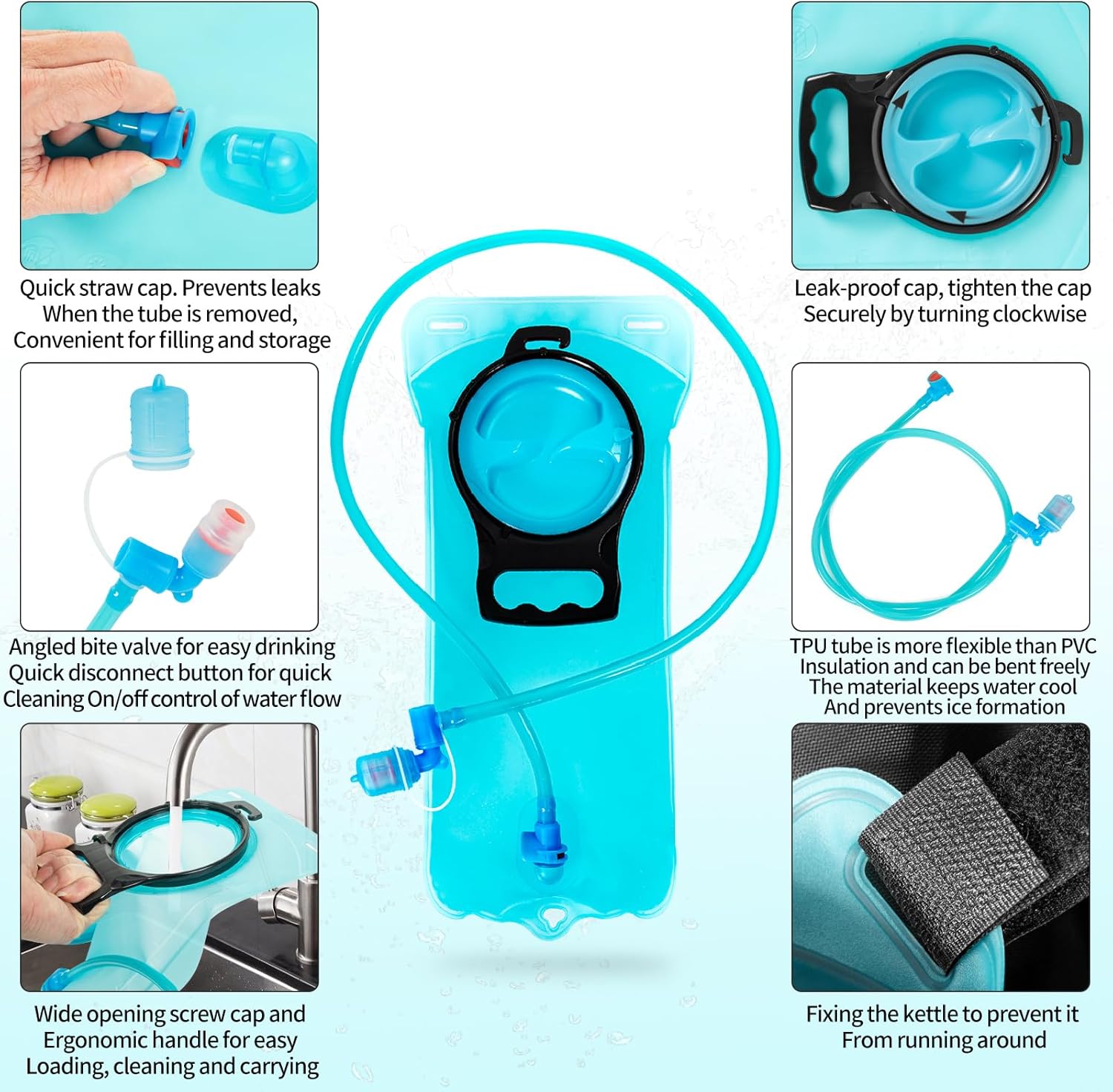 【Professional 2L Water Bag】: LASUK Hydration Backpack is an extra large 2L water bag made of TPU material, BPA-free and odorless. The fabric is easy to clean and add ice cubes. The 360-degree rotatable nozzle is convenient for front placement. The on/off valve helps to regulate the water flow. The large capacity of 2L ensures sufficient water supply during a full day of intense hiking/outdoor sports/hunting
