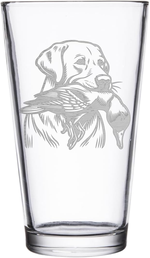 PREMIUM DESIGN: Hand-crafted pint glass featuring a beautifully laser-engraved hunting dog with duck design, perfect for outdoor and hunting enthusiasts. Black, chocolate or yellow labrador retrivers are all represented in the laser engraved dog glass.