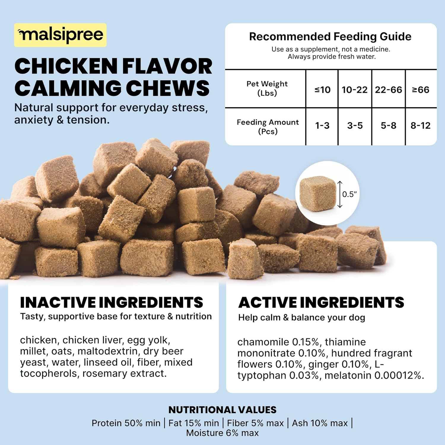For Extra Support: For pups scared of separation, nerves, or energy overload, our dog relief treats are made with ingredients known to relax and regulate mood. Help bring your pup peace of mind with MalsiPree’s calming treats for dogs