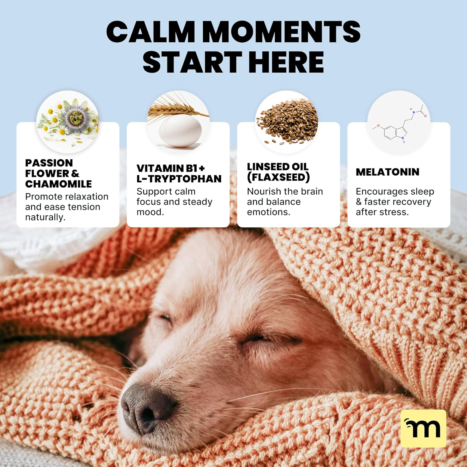 Thoughtful Formula: With Passion Flower & Chamomile known for relaxation, Vitamin B1 for irritability, Amino Acids for mood, & Melatonin for dogs known for sleep, our dog calming treats are made with ingredients shown to bring comfort without sedation