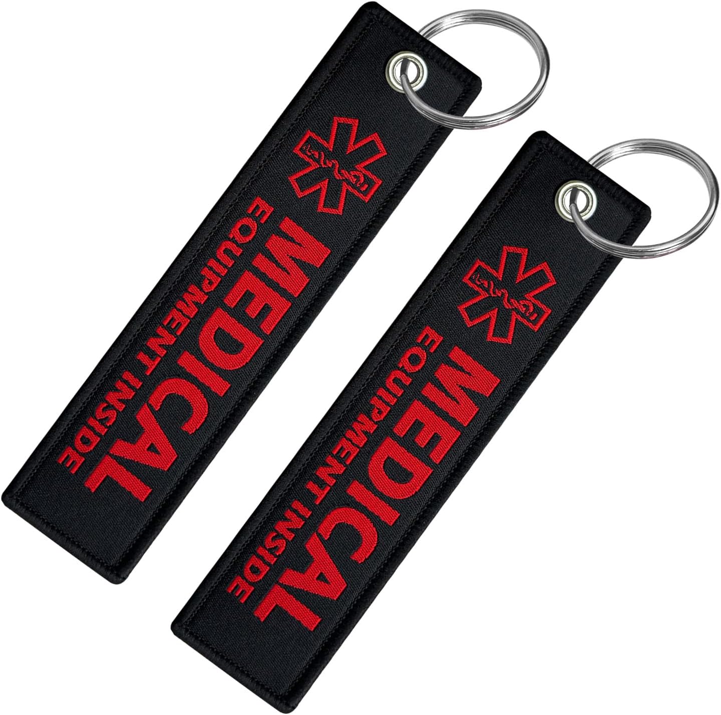 The medical bag tag features a red label embroidered on both sides of durable fabric, ensuring it is easily visible to others during emergencies.