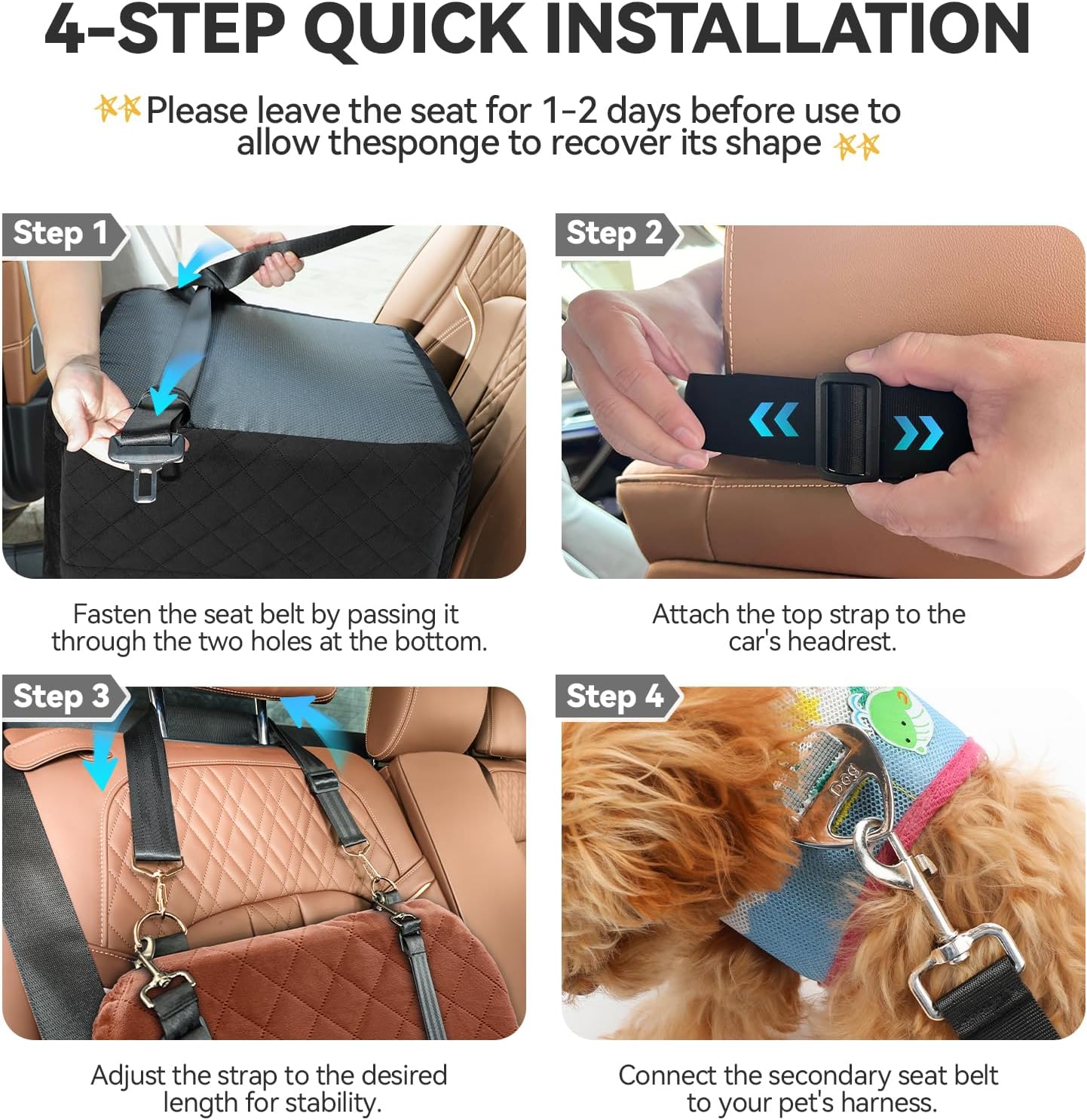 【Safe and Secure】This pet car seat features a built-in adjustable safety belts to secure your dog’s harness, preventing them from jumping out the window.The non-slip bottom and headrest strap keep the seat stable and secure, ensuring your pet stays safe and comfortable throughout the journey.