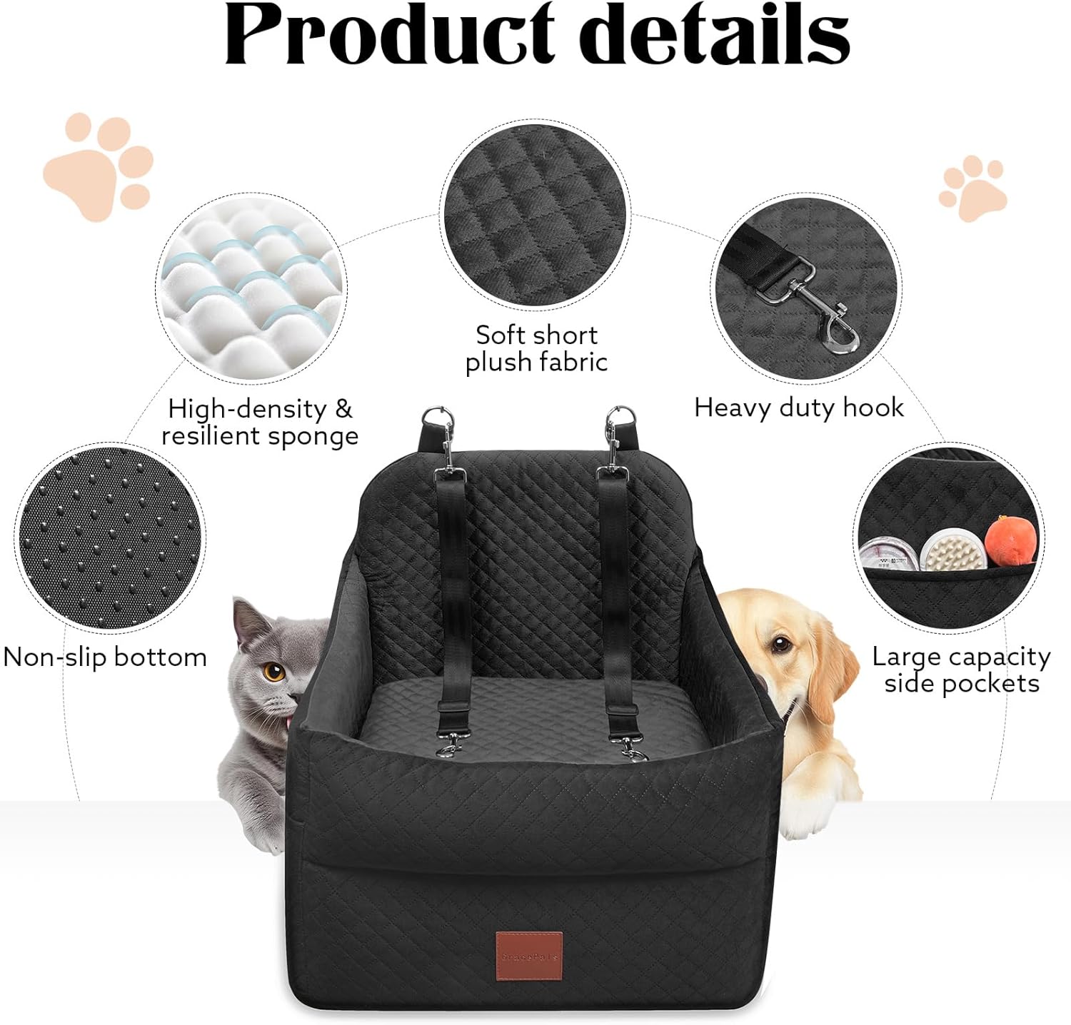 Comfort and Safety : The surface of dog booster car seat is made of short plush fabric, super soft and comfortable, and the bottom is filled with high-density egg-shaped foam to provide superior comfort and support, effectively reducing the impact of road bumps,Plus its underside and back are non-slip fabrics,this design prevents the seat from moving,ensuring a safe and comfortable ride for your furry friend
