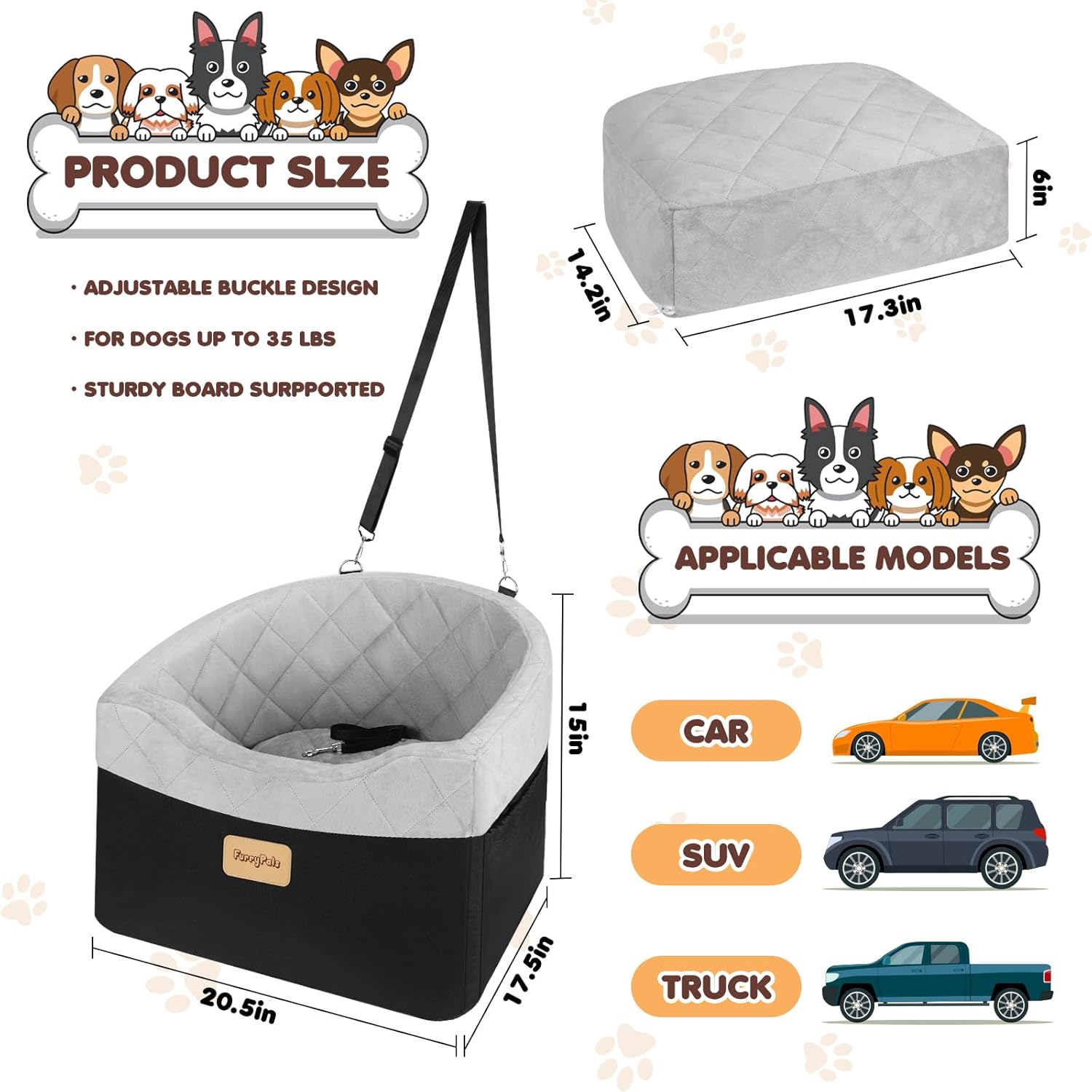 【Perfect Size】: This dog car seat measures 20.50 in (L) X 18.50 in (W) X 15 in (H). Designed to comfortably accommodate up to small/medium-sized dog weighing under 35 lbs, it’s ideal for breeds such as Yorkshire Terriers, Chihuahuas, Pomeranians, Dachshunds, Shih Tzus, as well as cats and puppies of similar size.