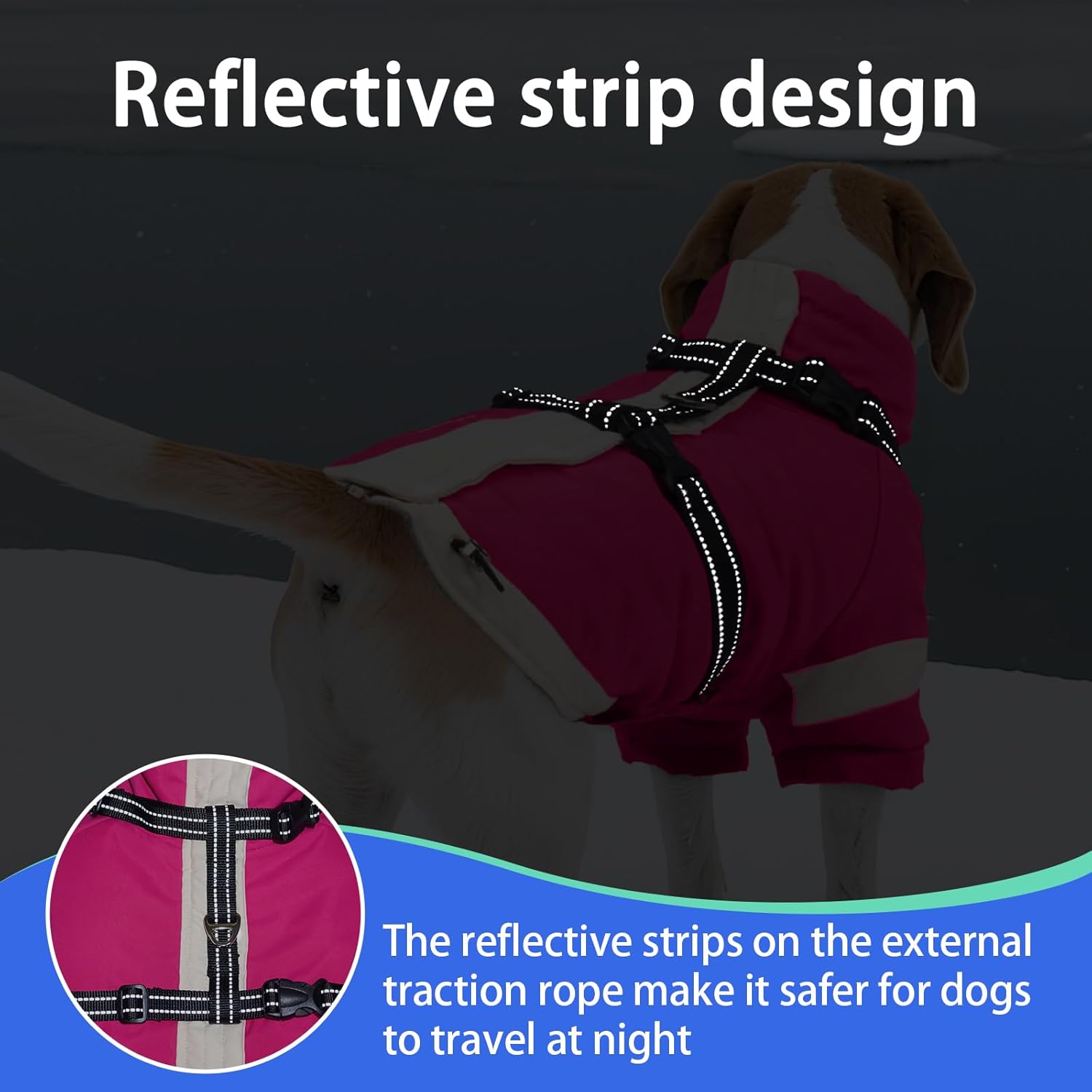 Warmth and Insulation : Our dog coats lock in body heat with thermal lining, keep dogs warm and cozy on cold days.Built-in Harness : Built-in harness for convenience.Waterproof & Windproof Shell : Waterproof and windproof exterior shields from snow, rain, and cold winds.Reflective Strips for Night Walks : Reflective strips provide visibility and safety during early morning or evening walks.Joint Protection : Long Sleeves provide coverage & warmth, supporting dog’s joints health in cold weather.
