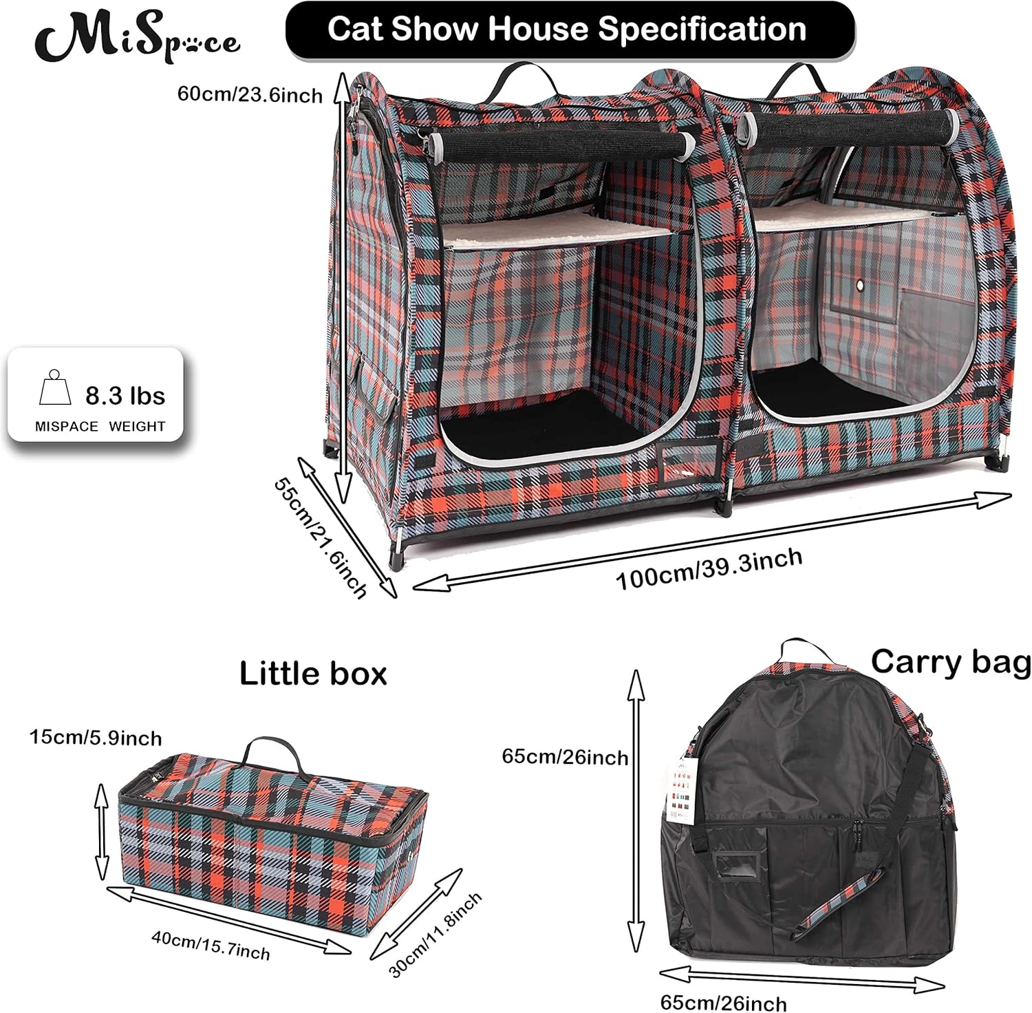REASONABLE SIZE – The cat condo’s size is 100 x 55 x 60 CM ;Weighing just 3.8KG and folds down to a travel size of 68 x 68 x 6 CM.