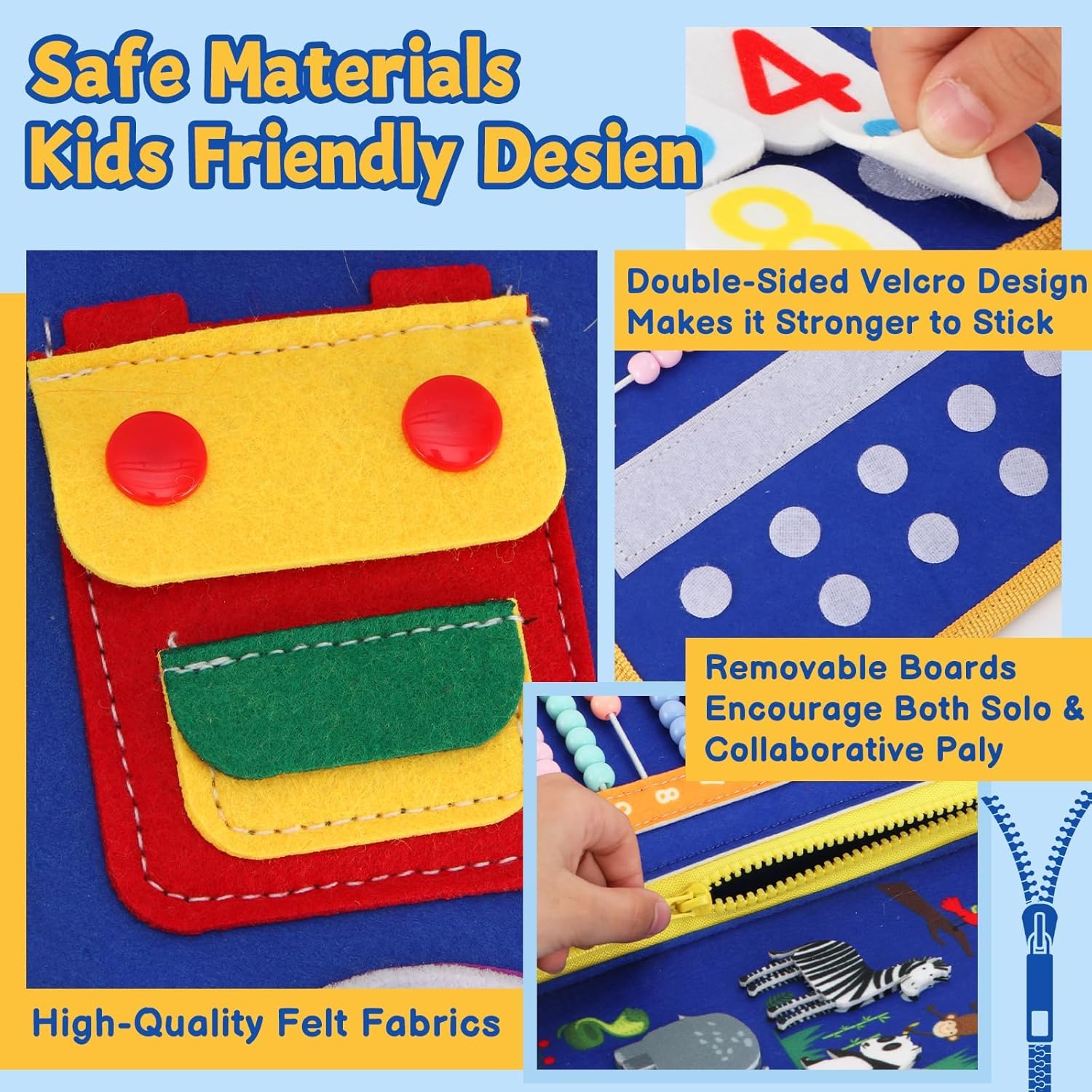 12-in-1 Montessori Learning Activities Develop essential skills through zipper, button, buckle, color, shape & alphabet matching games. This Montessori busy book encourages fine motor development, hand-eye coordination, and early cognitive learning for toddlers ages 2–4.