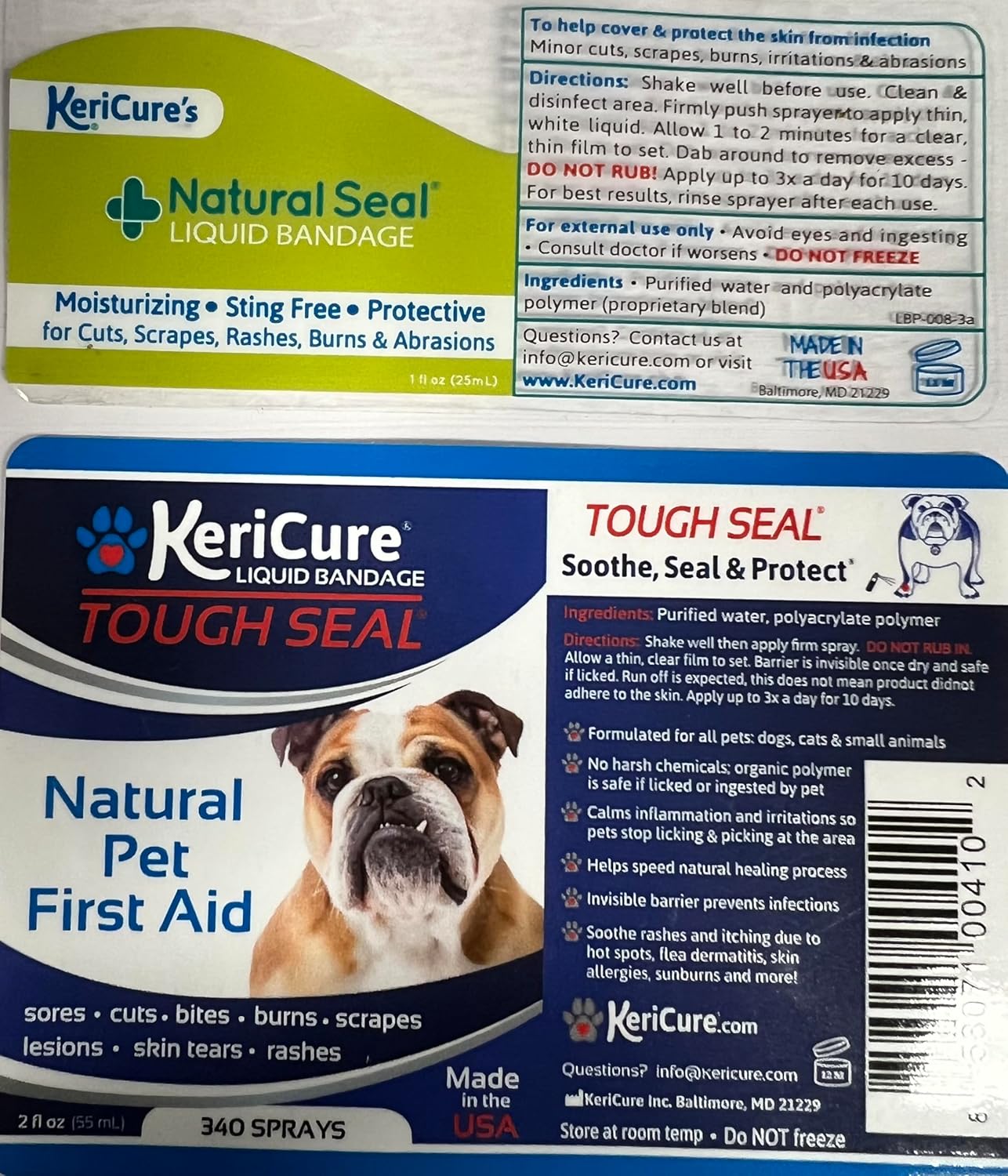 PROTECTION – Soothe, seal and protect with these spray-on bandages for people and pets. Use our liquid bandage to seal bleeding cuts, scratches, sores and bites. These products help speed up healing by blocking out dirt with KeriCure’s revolutionary nanopolymer barrier. Once wounds heal, the bandage falls off naturally. Waterproof and sweatproof, and Tough Seal is 100% safe if licked and is ideal after surgeries and for cuts after nail clipping