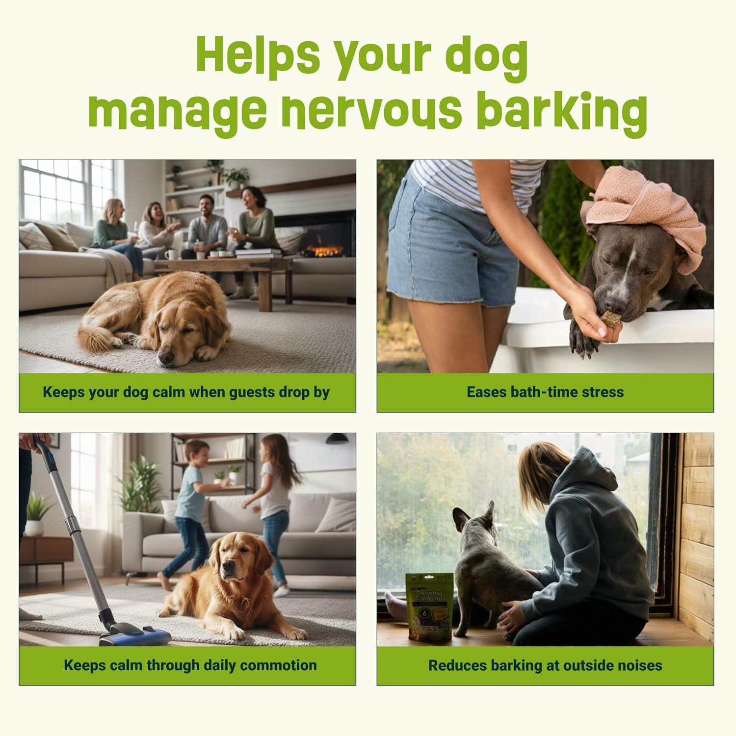 ✅ Calming & Relaxation Support for Dogs – Help your furry friend stay calm and comfortable during stressful moments like being left alone, loud noises, travel, or routine changes. These natural calming chews are formulated to promote relaxation, emotional balance, and everyday calm.