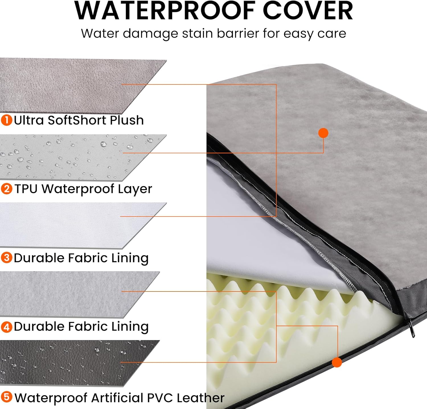 WATERPROOF LINER: The inner layer of the dog bed cover is designed with waterproof to protect the inner foam from urine. It protects the foam from accidents or any liquid penetration, thus promoting better rest and sleep for your pet