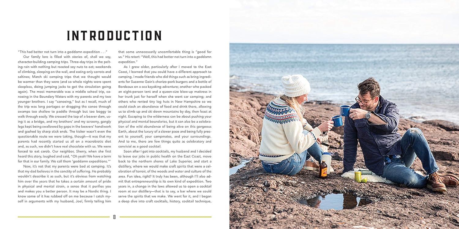 Cool off after a hot day spent hiking through the woods with a Flask Boulevardier or the Northwoods Sidecar.Break in the campsite with a Grilled Orange Cobbler or the ultimate beer-based cocktail.Greet the morning sun and luxuriate in the expanse of a day with no commitments with a BMB (Blueberry Maple Bourbon) or Spiked Arnold Palmer.Cozy up around the fire with the Salted Hazelnut Hot Chocolate, the Penicillin Toddy, a spiked hot apple cider, or your choice of bracing libation from a toasted marshmallow shot glass.