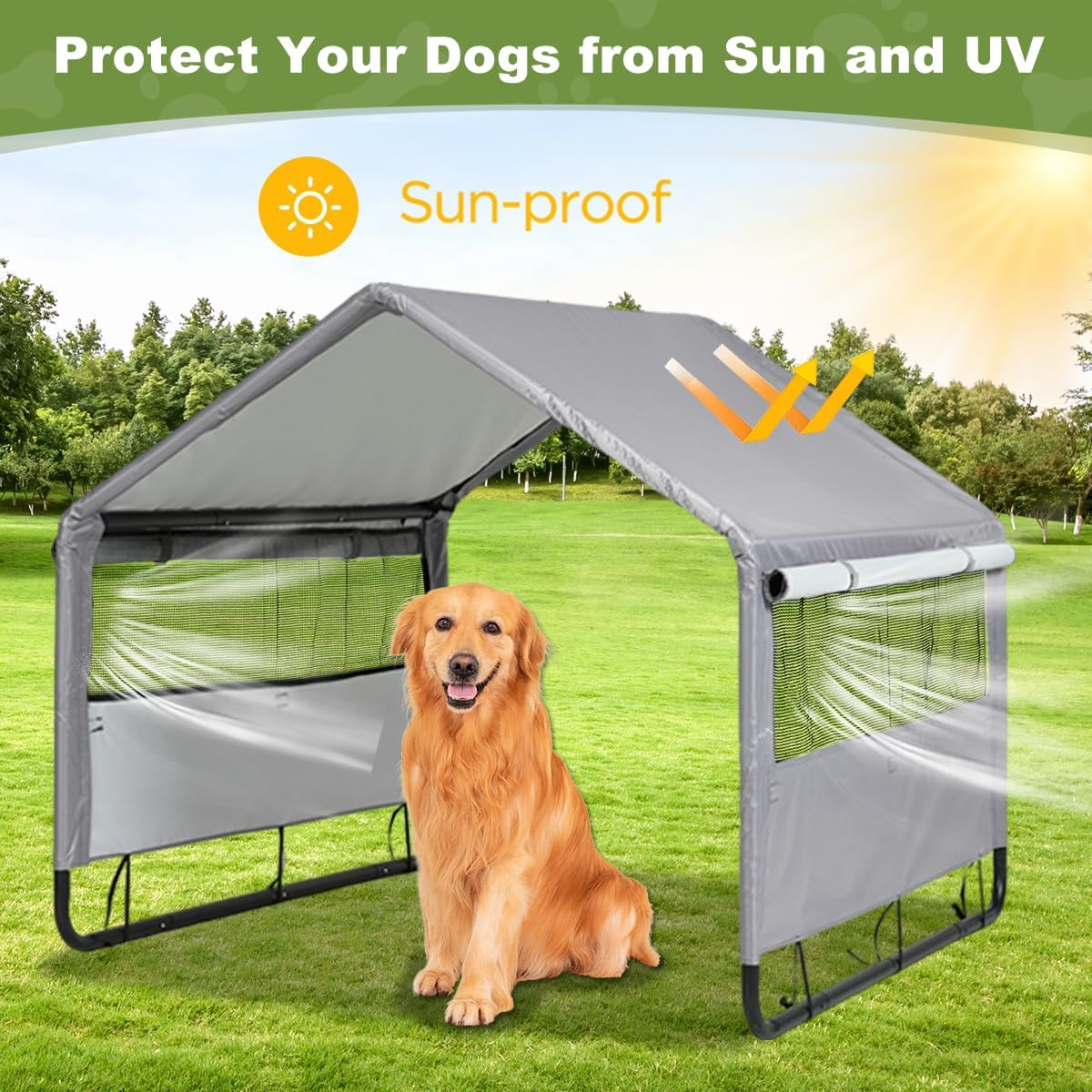 Sturdy Construction and Stability Upgrade – The frame of the pet shade is made of steel tubing with a powder coated finish that prevents the pet shade from rusting and corroding. Equipped with ground nails to keep the dog tent securely fastened to the grass to prevent it from being blown over by high winds