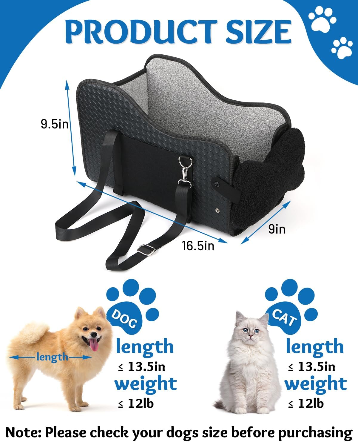 Small Dog Car Seat: This car seat is specifically designed for small dogs. It has the following dimensions: 16.5 x 9.5 x 9 inches. It is suitable for pets weighing less than 12 pounds with a body length of 13.5 inches or less (from neck to tail). Measure your dog and the central console of your car before purchasing to ensure a proper fit