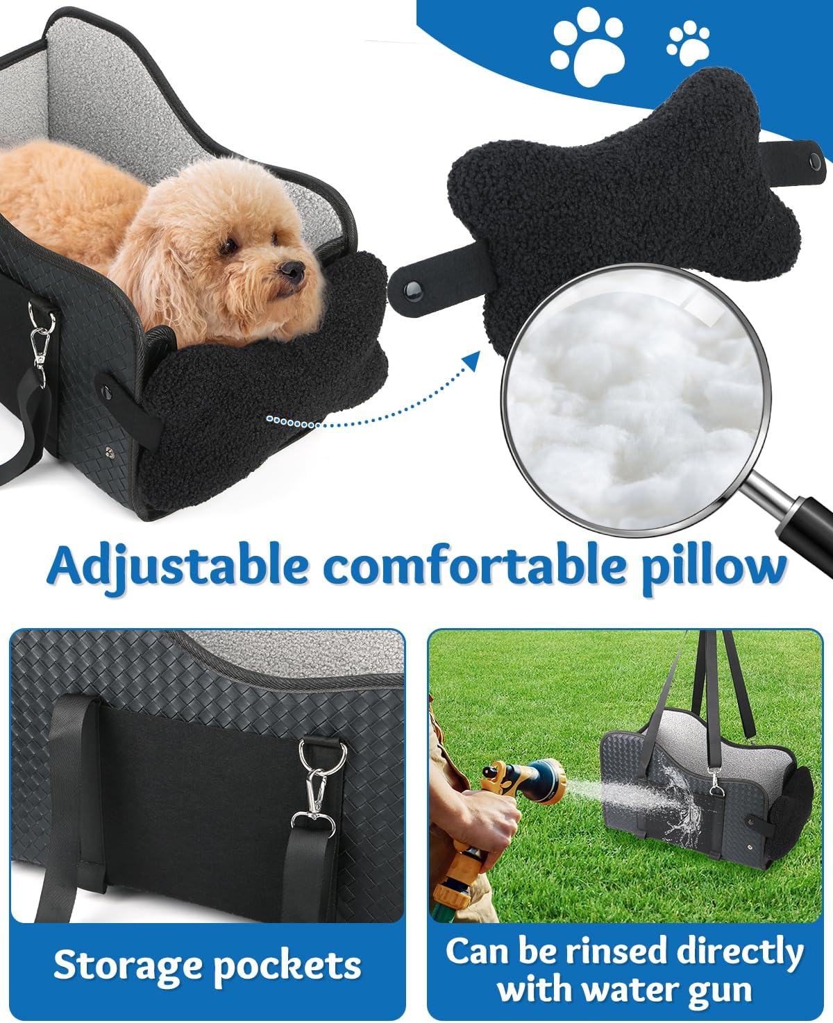 Comfortable: The dog car seat comes with a double-sided cushion. One side is made of soft teddy fleece fabric for ultimate comfort and durability, while the other side is made of a breathable, cooling, silk-like fabric for use in warmer weather. The cushion is machine washable and can be used all year round. The soft headrest provides a comfortable place for your dog to rest their chin and relax