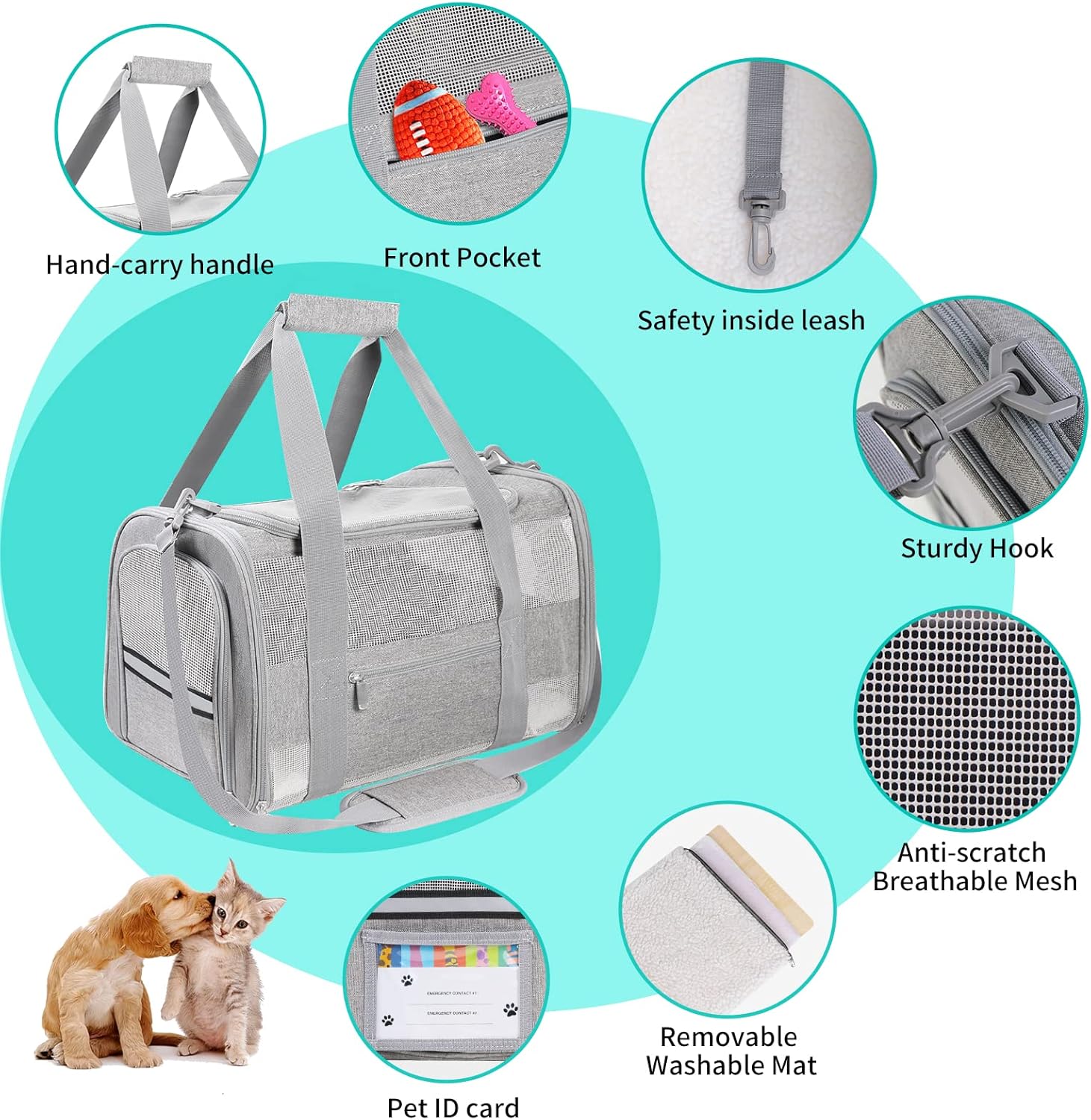 🥰【Safe and Durable】Cat Carriers for Medium Cats Under 25 is made of durable, lightweight and waterproof polyester fabric. This soft-sided cat carrier comes with four-sided mesh and three-sided entrance giving plenty of openings and air for cat dog with top opening. With zippers on both top and side, your lovely puppy can be put in and out of our dog carrier easily.
