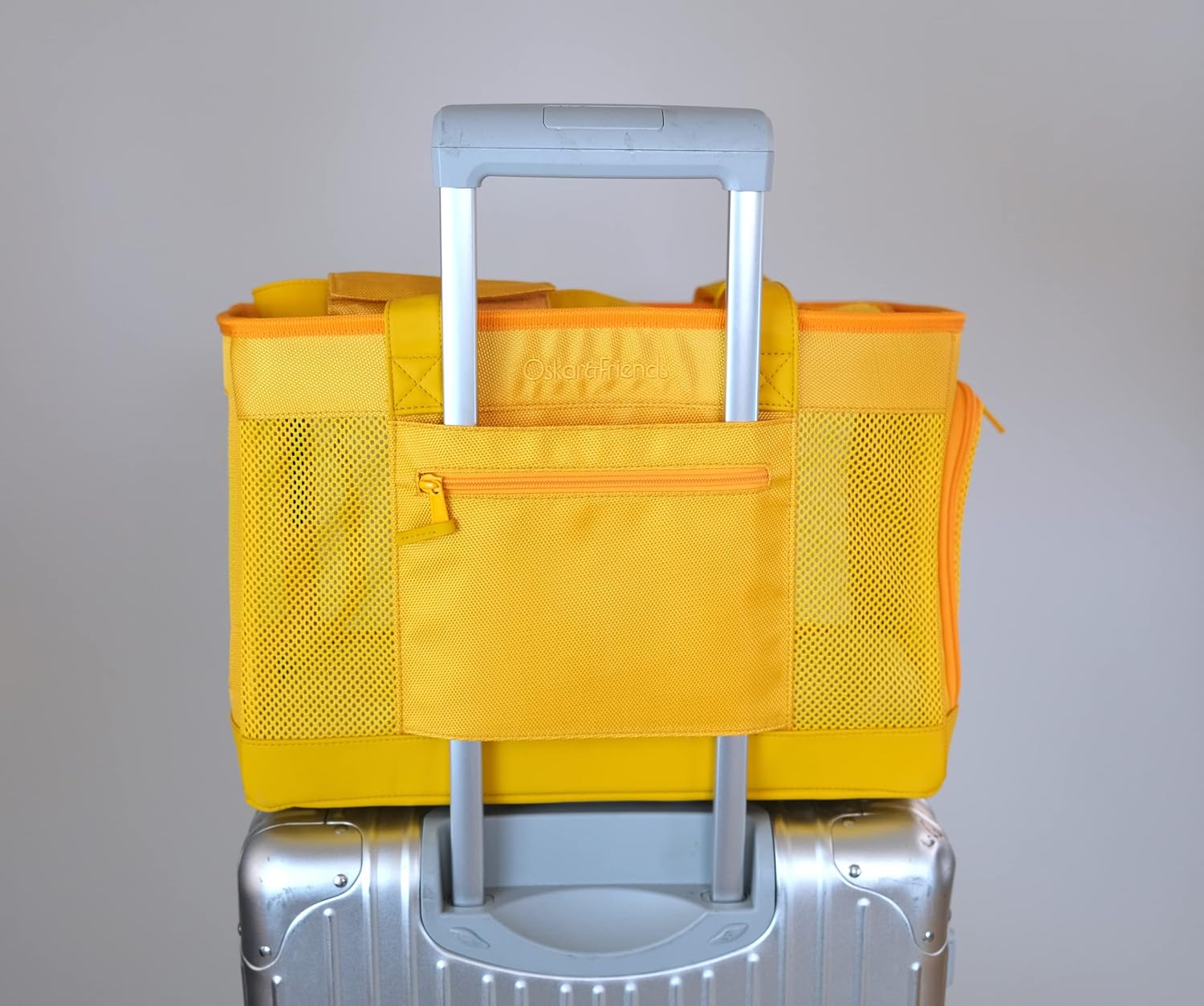 Our airline approved pet carrier features a luggage handle adapter that will accommodate most suitcases.