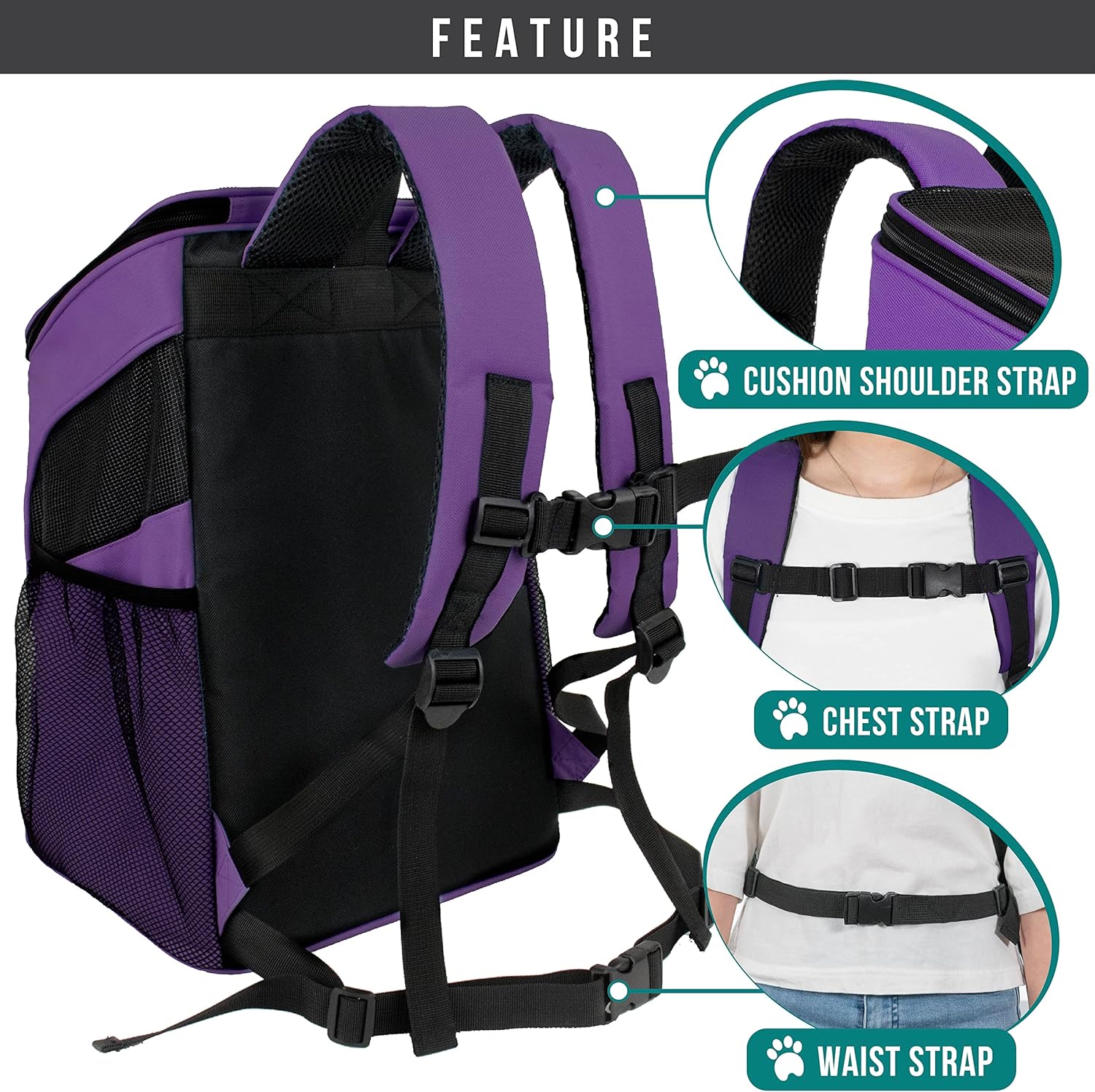 AIRLINE APPROVED CAT AND DOG CARRIER BACKPACK: The pet carrier backpack is airline-approved and fits under most airplane seats. Lightweight and easy to carry, this tsa approved soft dog carrier backpack for small dogs offers a luxurious ride. The interior of this cat bookbag carrier also comes with a dual zippers and safety strap for pet collar to secure the doggie and prevent escape. The two large side mesh pockets can store pet accessories, stuff, essentials, water bottle, food and treats