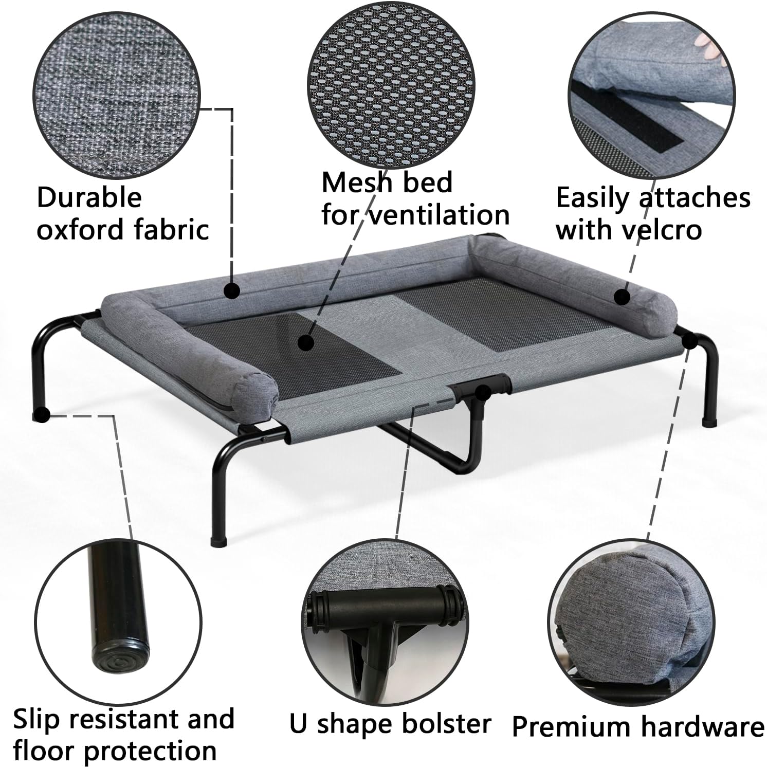 【BOLSTERED DOG BED】 Made of waterproof, heavy-denier fabric with soft and resilient bolster for ultimate pet comfort and security. Raised dog bed helps pets stay cool in summer months by allowing air to circulate and keeps pets off wet/cold ground with 7″ ground clearance.