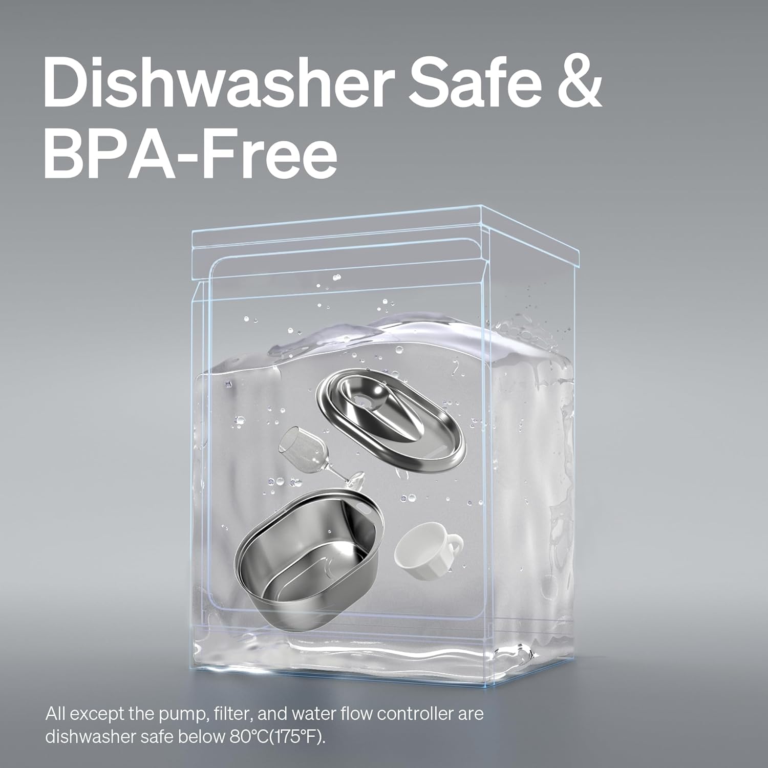 Durable 304 Stainless Steel & Dishwasher Safe: PETLIBRO cat water fountain made of 304 stainless steel, it is BPA-free, rust and corrosion-proof. Only the stainless steel part can be washed in the dishwasher.