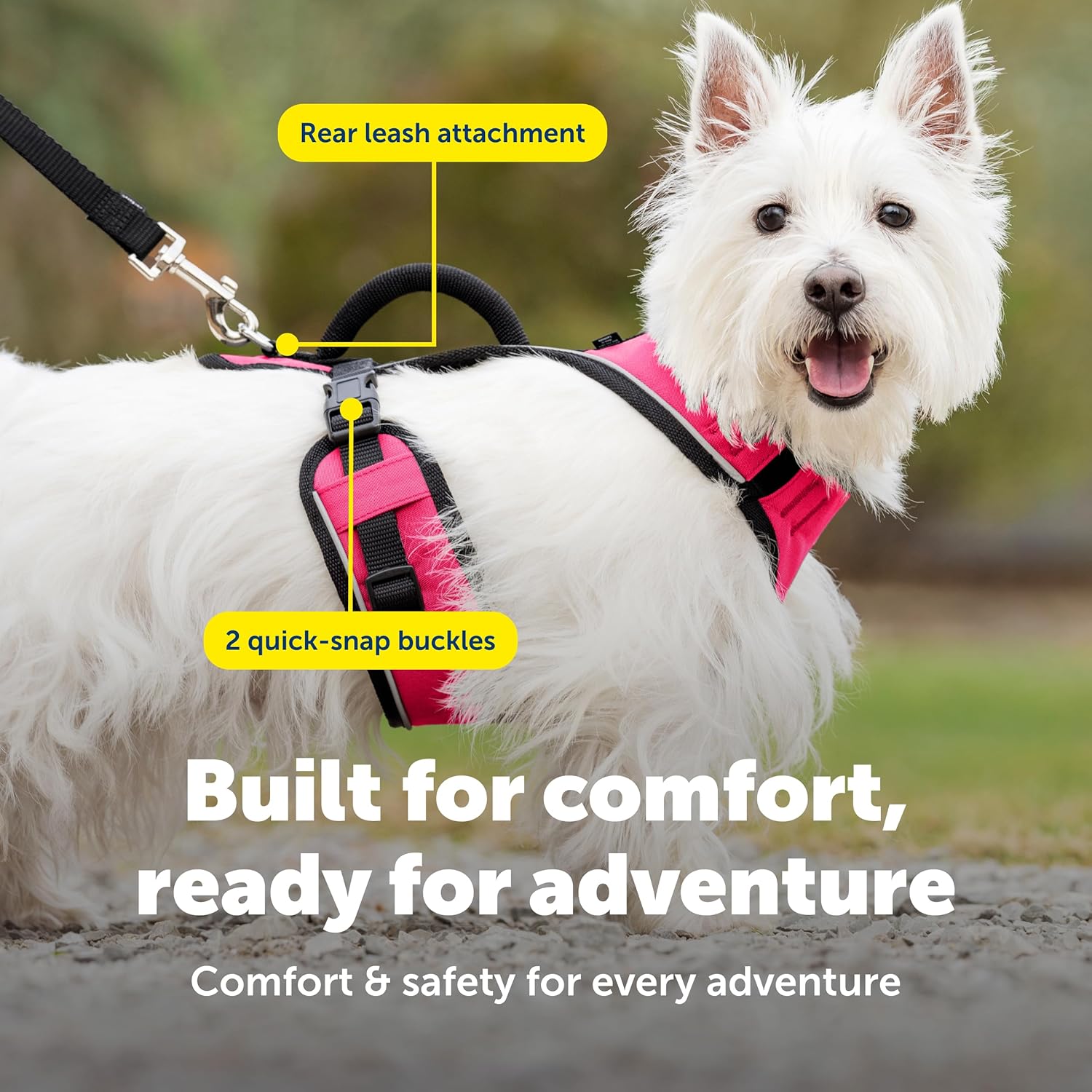Visibility & Convenience: Reflective piping boosts nighttime safety while the quick put-on/off design with only two buckles makes this harness easy to grab and go