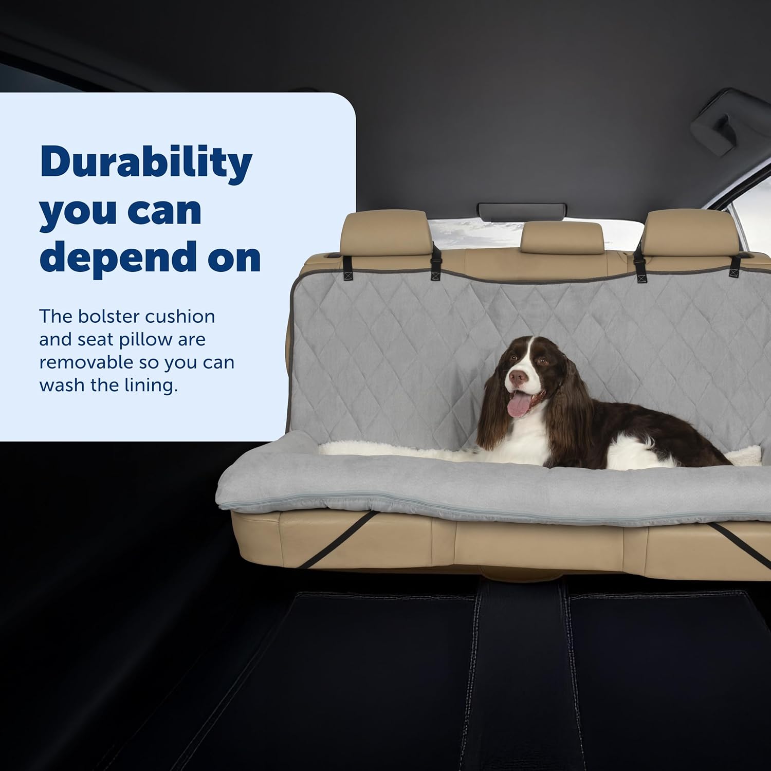 COZY COMFORT: Soft, microsuede liner covers the over-stuffed bolster cushion and pillow; this comfy cuddler is perfect for pups who like to snooze on long car rides