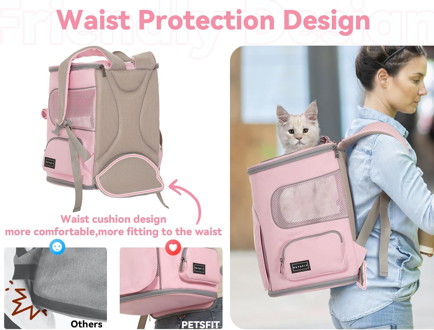 【Ergonomics Design】No more carrying pressure. The enhanced pet backpack carrier features an added waist protection design at the back, delivering a better fit for extended journeys. It effectively alleviates the burden, resulting in a more effortless and enjoyable travel experience for both you and your furry companion
