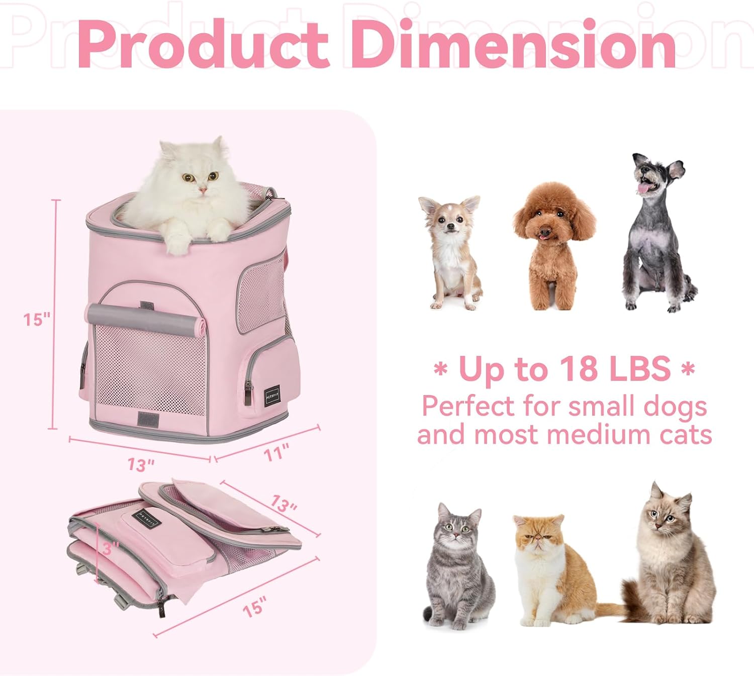 【Spacious Interior】The dog backpack measures 13″L × 11″W × 15″H, and folds easily to carry outside. Providing plenty of room for your pet to move around. Perfect for medium-sized cats and small dogs, up to 22lb / 10 kg, Please check the pet backpack size carefully before purchase