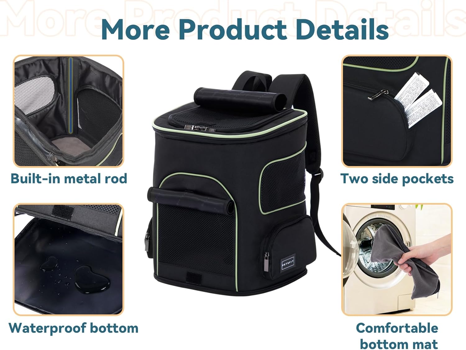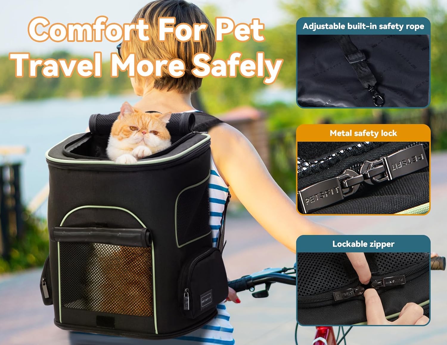 【Comfortable and Durable】 This cat backpack for carrying cats features a well-designed ventilation system with mesh windows on all four sides, ensuring optimal airflow and visibility. The top of the dog carrier backpacks and the front screen window are equipped with windproof sunshades, offering both safety and privacy. This reduces your pet’s stress response to external stimuli while traveling