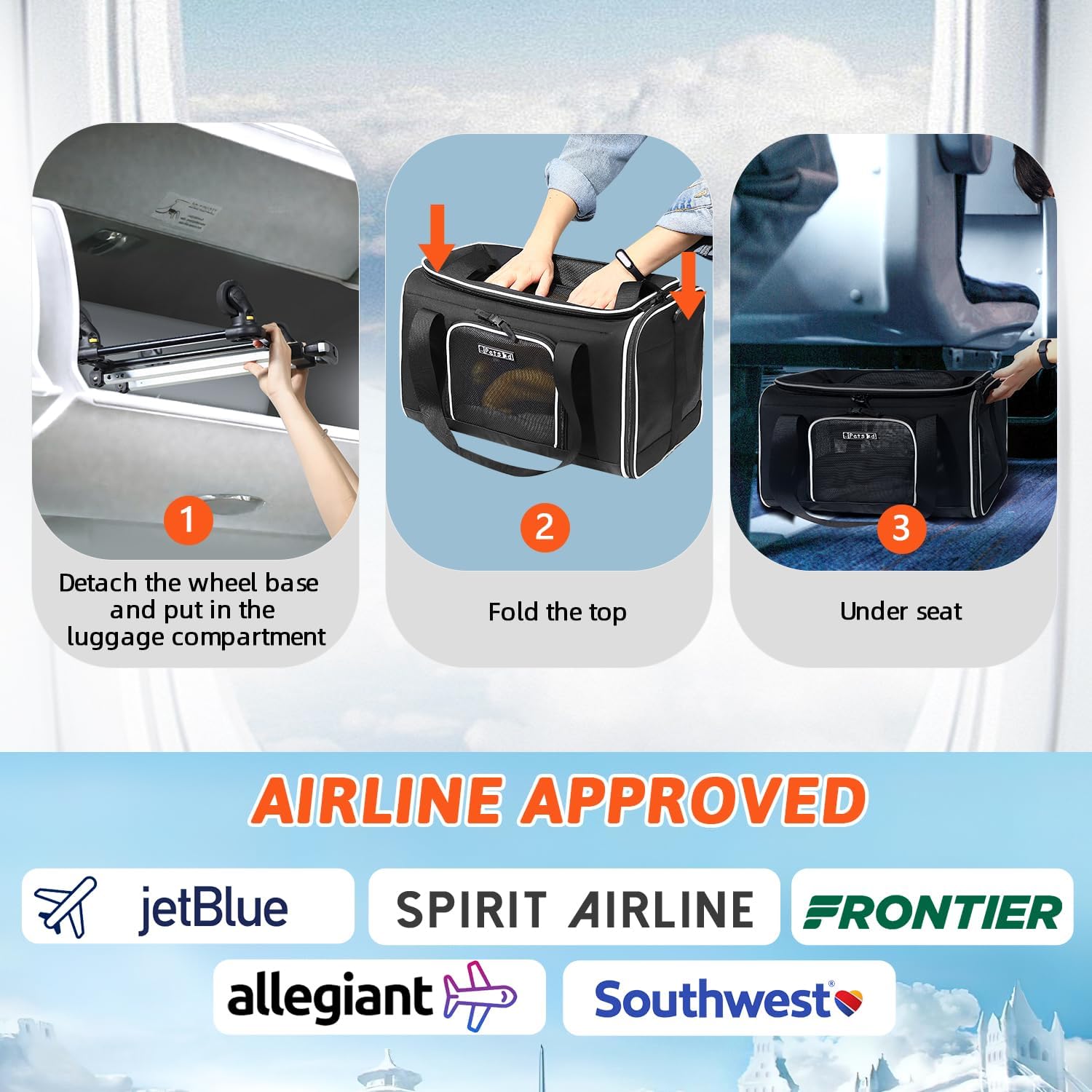 【AIRLINE APPROVED CARRIER 】Unfolded size:17″L×12″W×(8.5+3.5)”H, Petskd pet carrier is TSA approved and can be placed under the seat in the cabin(after remove the wheel base), it is mainly designed for ①JetBlue Airlines ②Allegiant Airlines ③Spirit Airlines ④Frontier Airlines, but also in compliance with ⑤Southwest Airlines. We recommend you buy this carrier when you fly with the above-mentioned airlines.