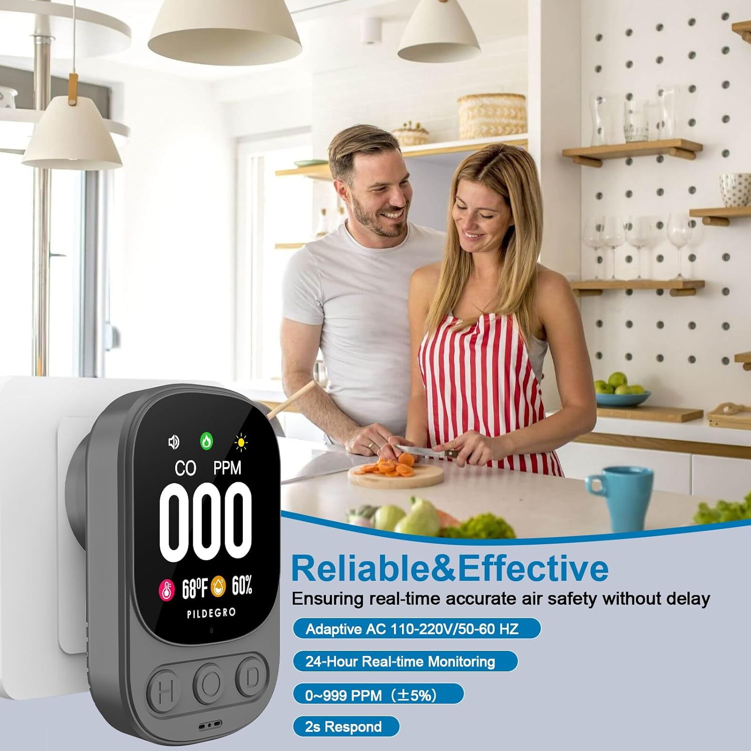 ๐Ÿ‘. ๐Ÿ‘-๐ข๐ง-๐Ÿ & ๐”๐ฌ๐ž๐ซ-๐…๐ซ๐ข๐ž๐ง๐๐ฅ๐ฒ ๐ƒ๐ž๐ฌ๐ข๐ ๐ง: Integrated Temp (14~122ยฐF/-10~50ยฐC, ยฑ3%) and RH (5~95%, ยฑ5%), along with an adaptive AC110-220V plug-and-play design, installation and use have never been so easy! Switchable display interface, focusing on CO or Temp/RH, catering to diverse usage scenarios. Just plug in and let Pildegro do the rest! Ideal for homes, kitchens, garages, RVs and hotels.
