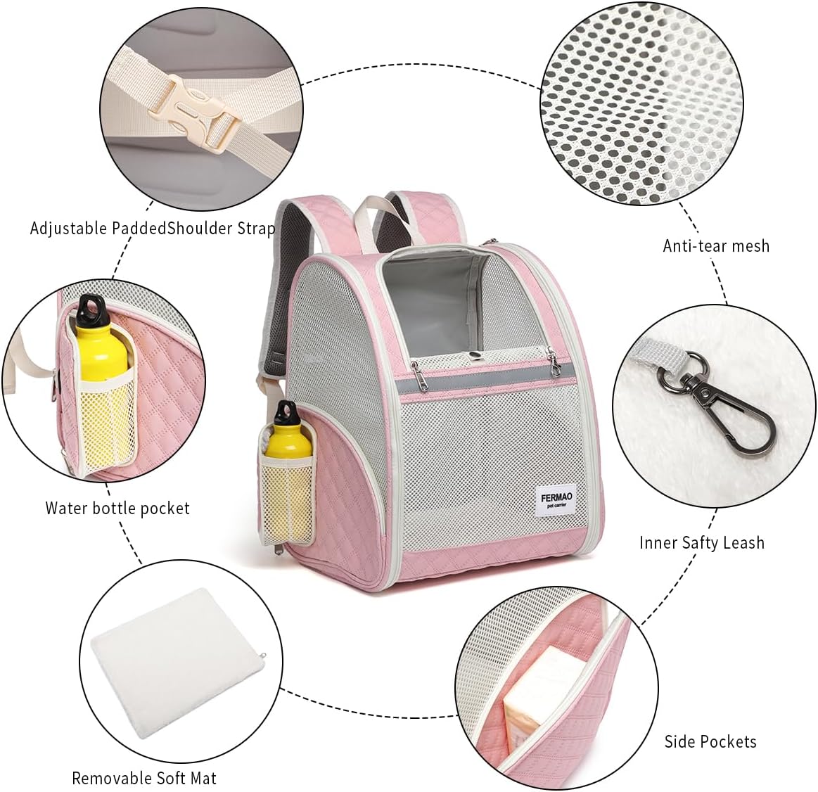 Safe and Comfortable:Removable and washable mat,Keep your cat’s backpack clean and comfortable;There’re three entrances and one prevent escape clasp,Prevent pets from jumping out of the bag,your cat will stay secure inside the backpack