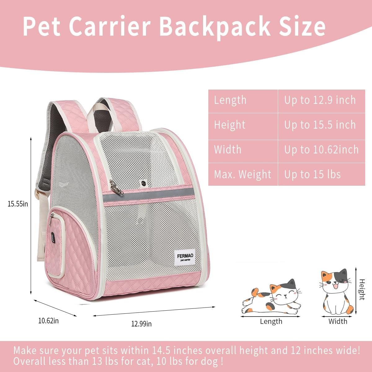 Airline Approved Pet Carrier:12.9″ L x 10.62″ W x 15.5″ H. For pets under 15 bls;fit for cats, puppies, small medium sized pet;you can taking pets to outdoor activities, hiking, walking or cycling;Please Check your airline requirements before traveling