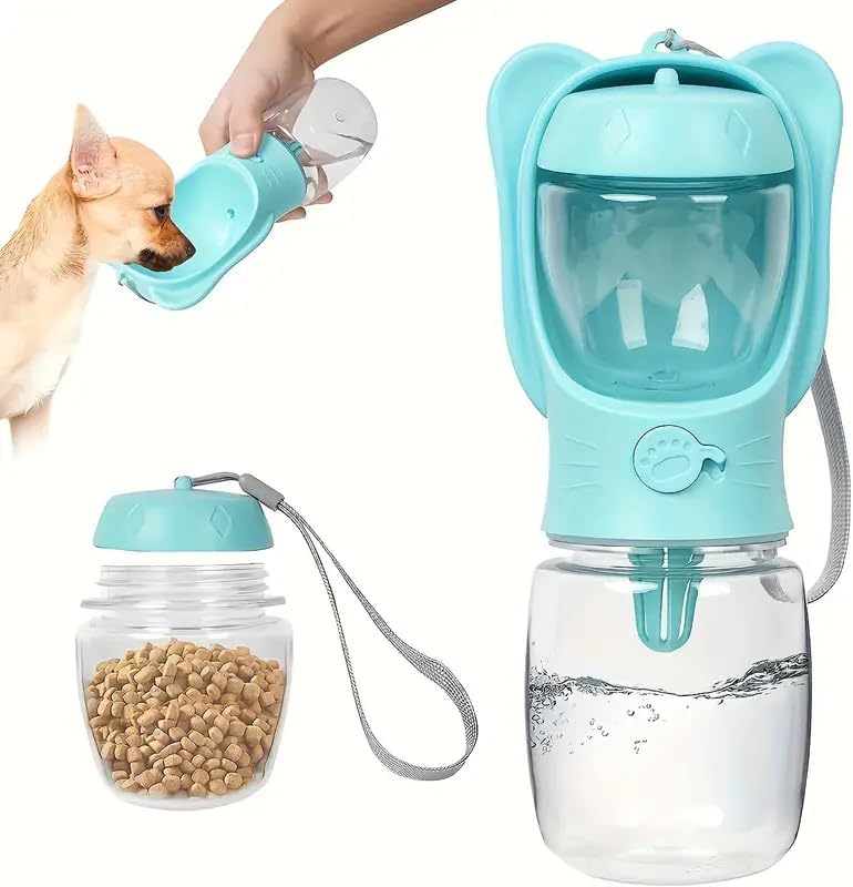 The 2-in-1 portable design perfectly combines a dog water bottle and a food box. The food box can fit perfectly into the water bottle, making it perfect for outdoor activities, walking, or family travel.