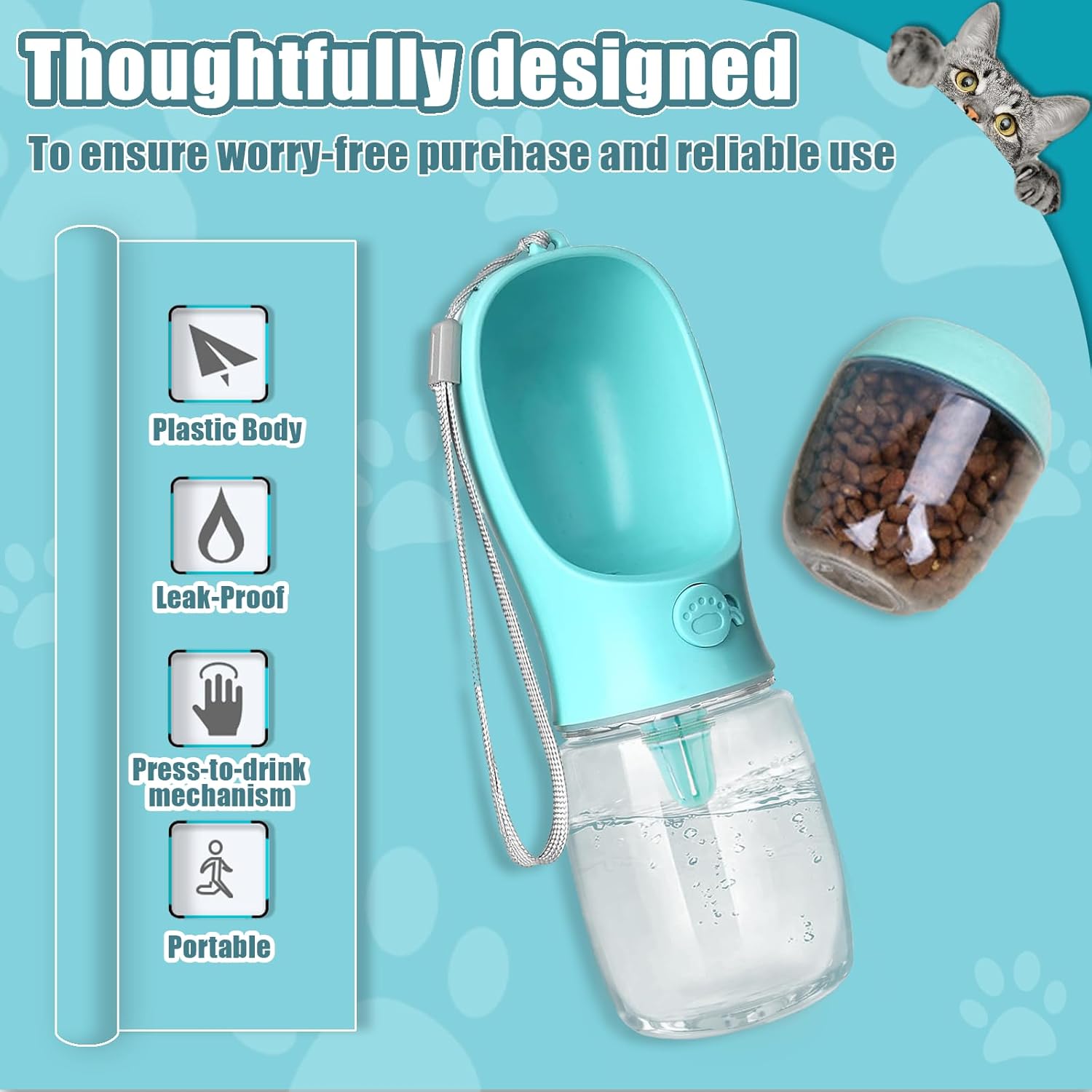 1 Container, 2 Uses: Integrates a 180ml treat container with a water bowl (no extra bulk), replacing separate ordinary dog water bottles. Ideal for strolling/travel—provides fresh water and snacks without extra containers.