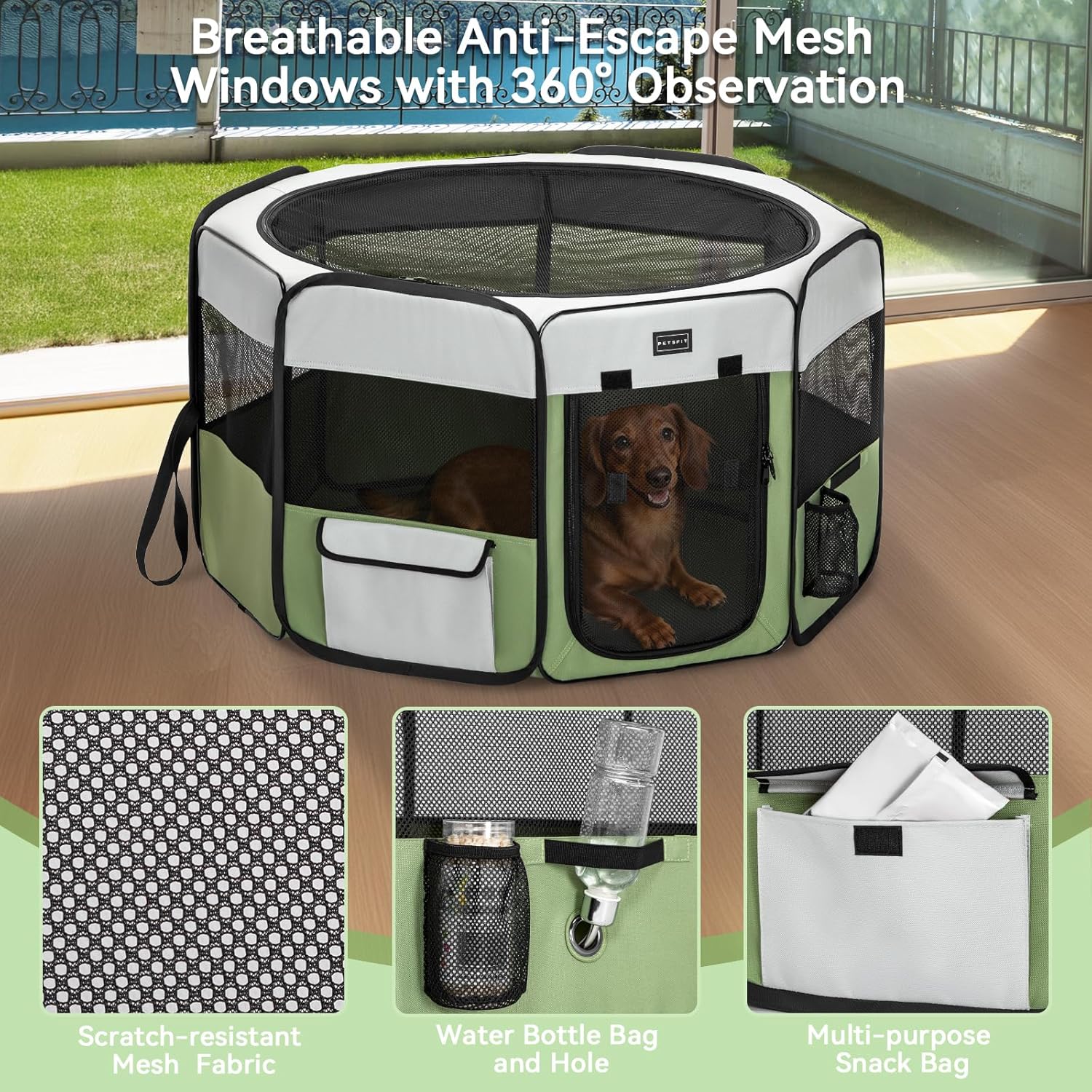 Sturdy and Escape-Proof Design:This portable dog playpen features tear-resistant 600D Oxford fabric with double stitching. Its sturdy octagonal design ensures stability and prevents folding,offering durable and reliable containment