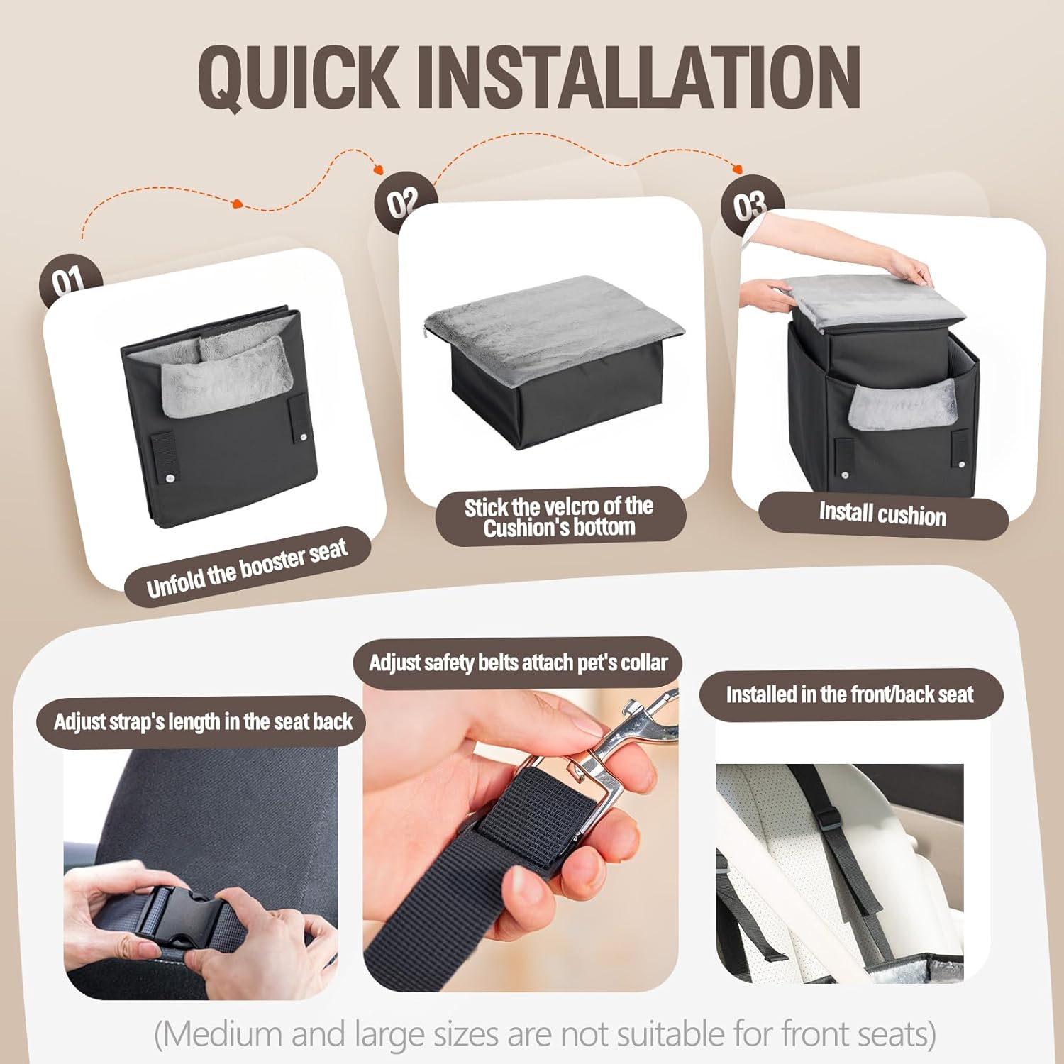 【SAFER ROAD TRIP】the size of the small doggy car seat is 15.8″l x 16.5″w x 12.6″h, please measure your pet before purchase.dog booster car seat bed for small pet dogs adjustable strap around headrest to keep pet safety. it make road trip more secure to attach safety leash to your pet’s collar/harness