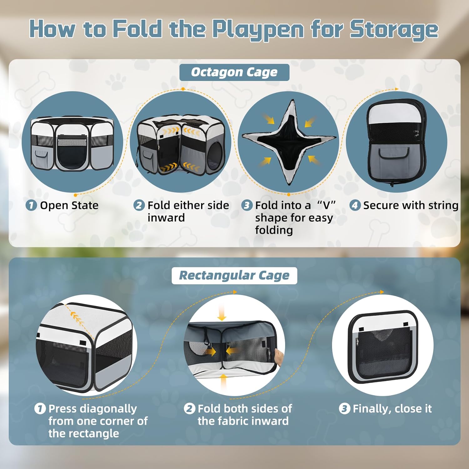 【Comprehensive Upgrade – Safe and Durable】We have upgraded the parts users care about most, using high-density, durable 600D Oxford fabric and reinforced, thickened breathable mesh for greater durability and resistance to scratching. The portable dog playpen frame is reinforced with elastic wire, and the seams and corners are strengthened for enhanced stability, ensuring your pet’s safety. Note: This does not prevent continuous chewing; please choose based on your pet’s habits