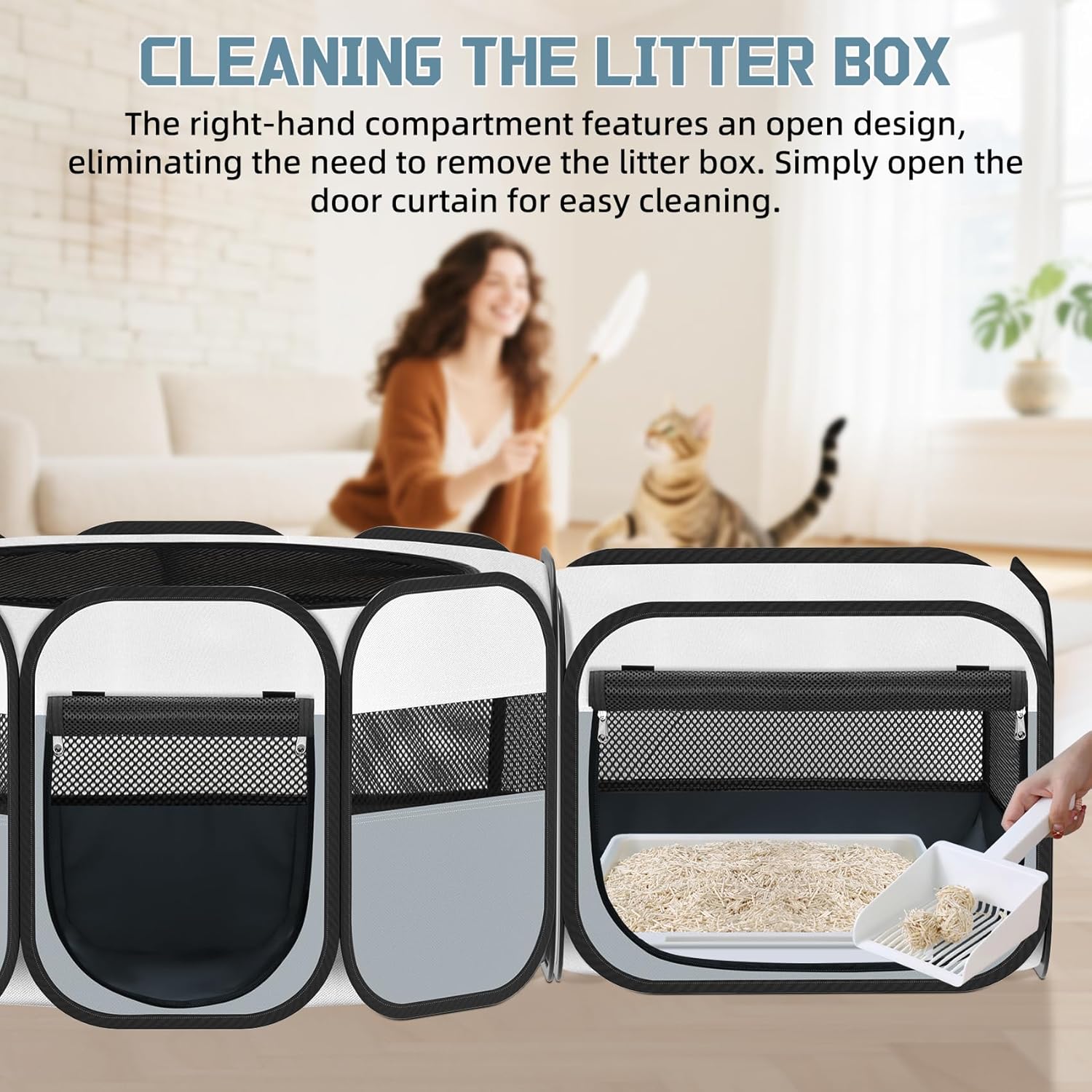 【Flexible 2-in-1 Design – Double the Comfort】This cat play pen features a unique 2-in-1 design, with two independent fences that can be used separately to prevent pets from competing for resting areas, or connected internally to create a passageway, easily dividing the resting area from the litter box/play area. The spacious interior allows pets to play, sleep, hide, or isolate themselves freely, significantly enhancing their comfort and enjoyment
