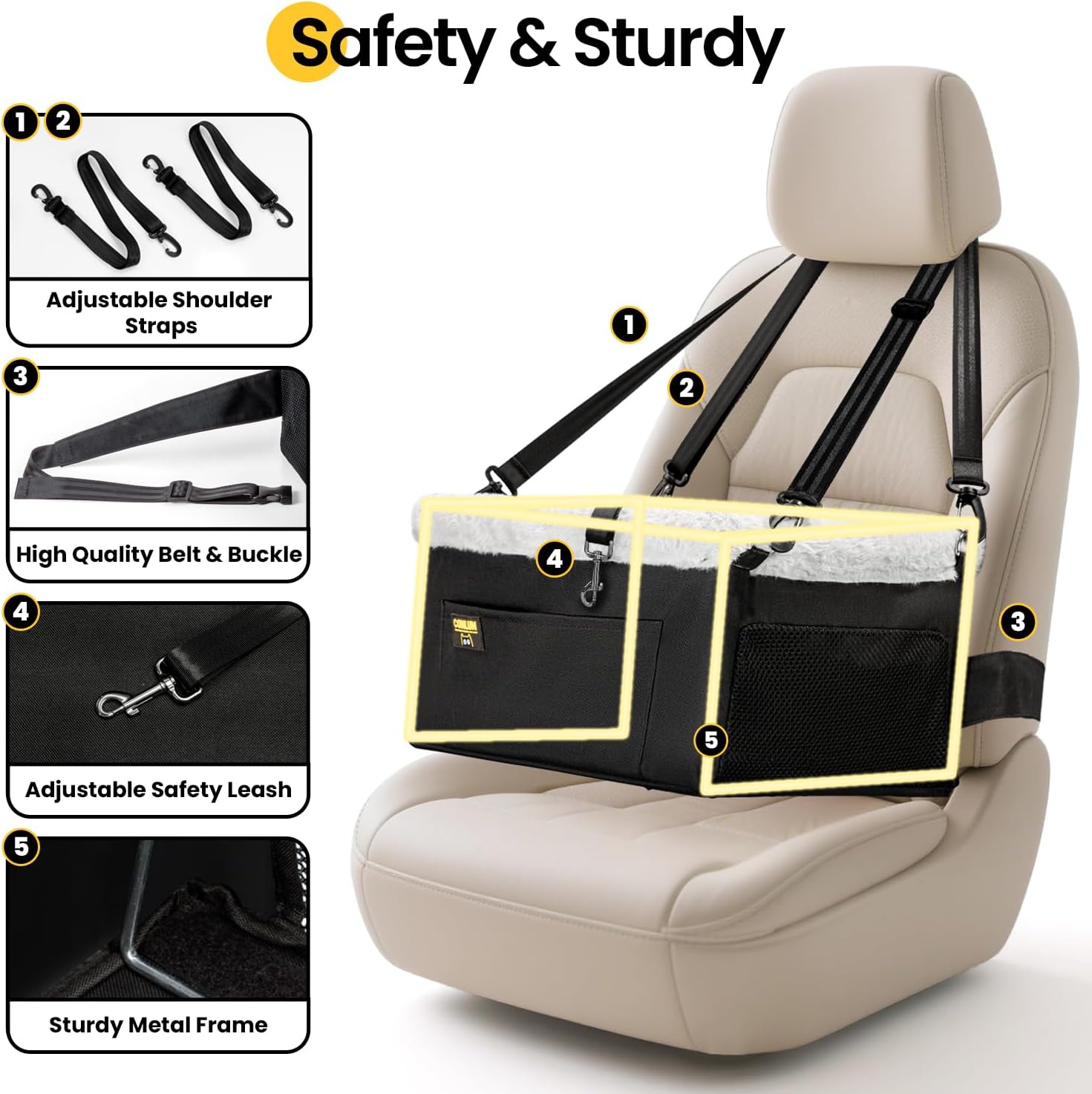 Proactive Safety Duo: Belt + Leash. Secure this pet car seat tightly in most vehicle—cars, SUVs or trucks—on front or back seats using heavy-duty adjustable straps & the wide anti-slip center strap. The built-in leash click-locks to your pet’s harness, preventing escapes. Compatible with most seat types for versatile safety in your dog booster car seat.