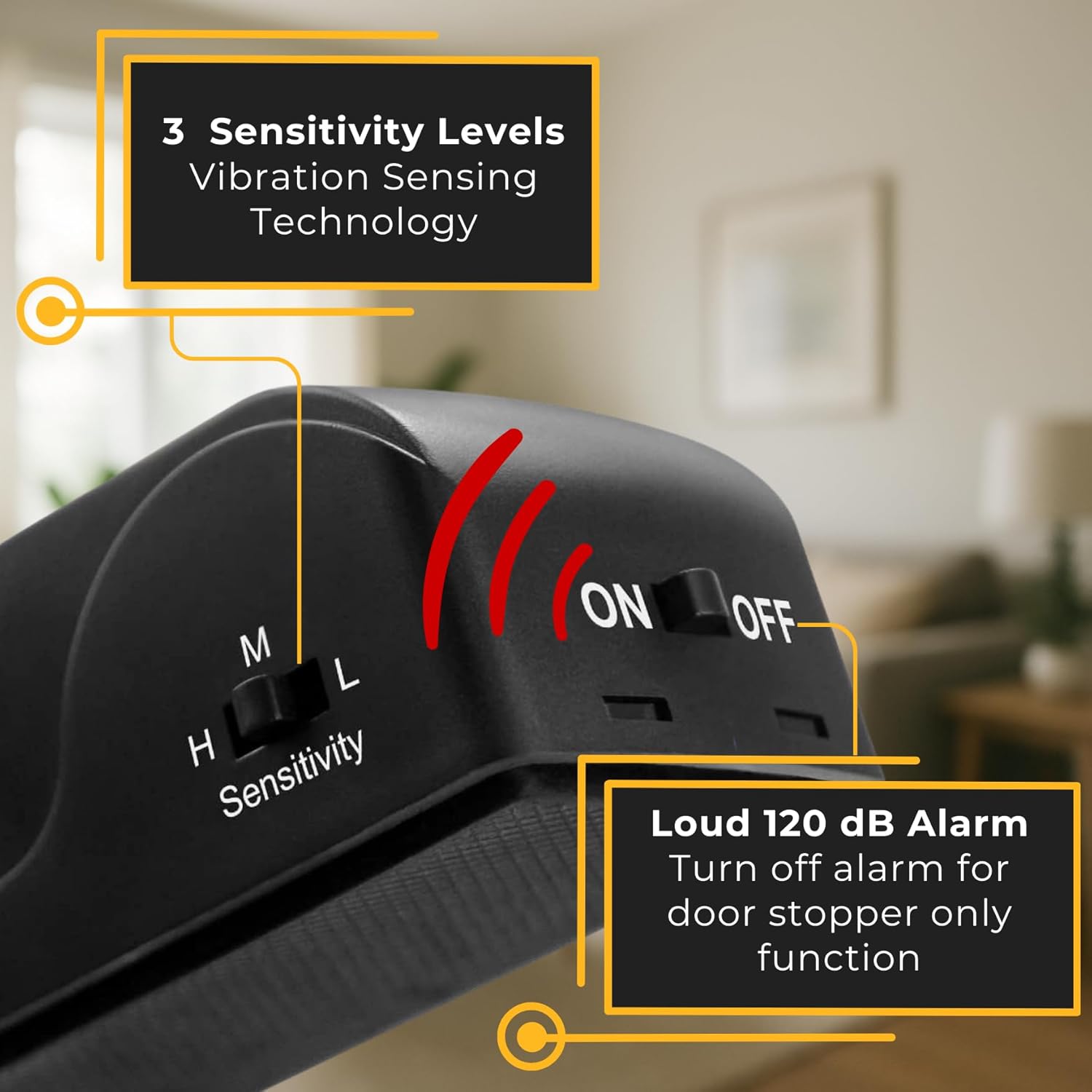 120DB DOOR STOP ALARM + NON-SLIP GRIP – Wedges under the door and blocks entry while a loud 120dB siren deters intruders and alerts others. Adjustable sensitivity (High/Medium/Low). Best for door-to-floor gaps 0.6″–1.2″; anti-slip rubber base grips wood, tile, and carpet.