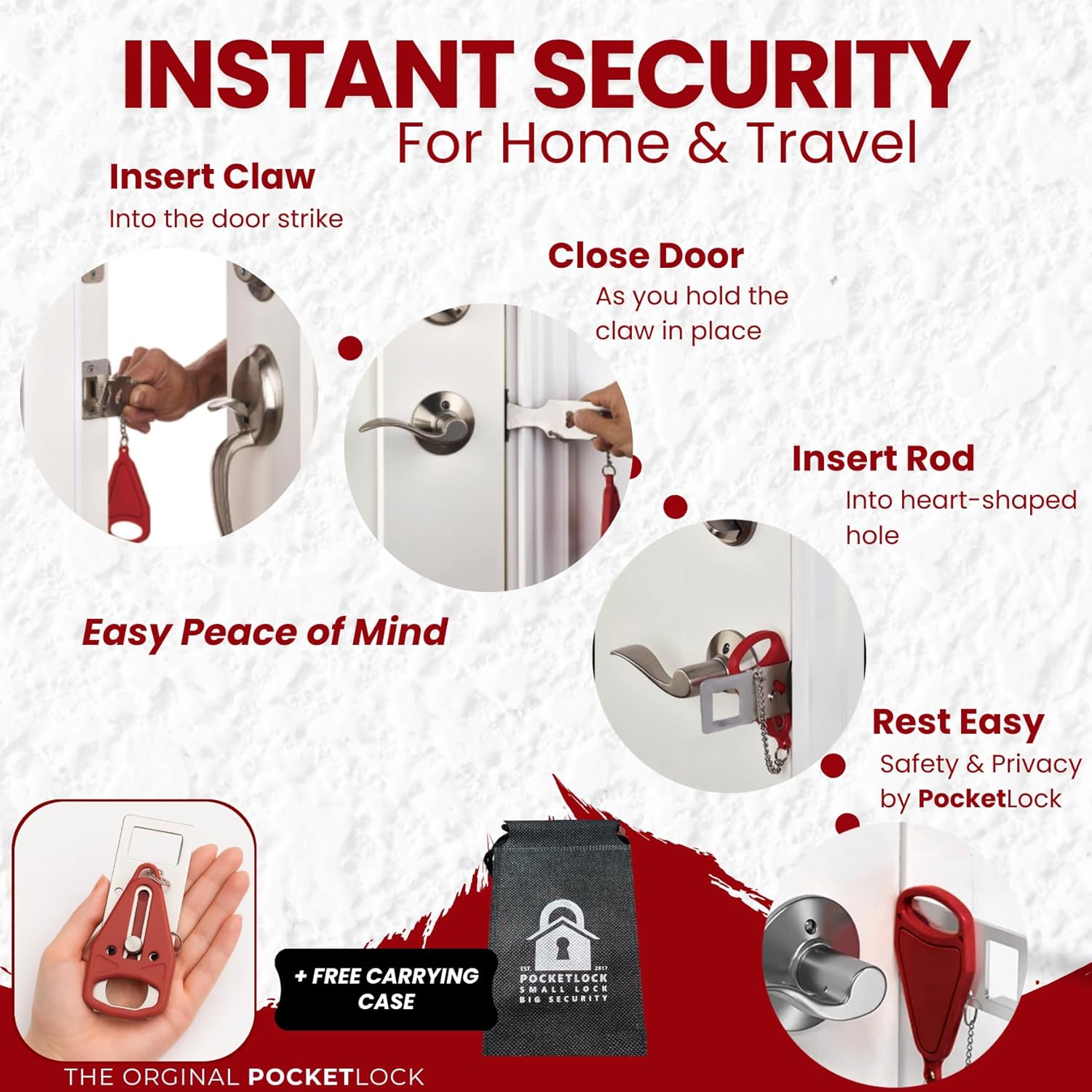 TRUSTED PROTECTION + U.S. SUPPORT – Ideal for women travelers, solo travelers, students, seniors, and renters seeking hotel door security and apartment safety. PocketLock is a proud U.S.A. company with responsive support. In the box: 1 portable door lock (with 2 inserts) with carrying case, 1 door stop alarm, quick-start guide.