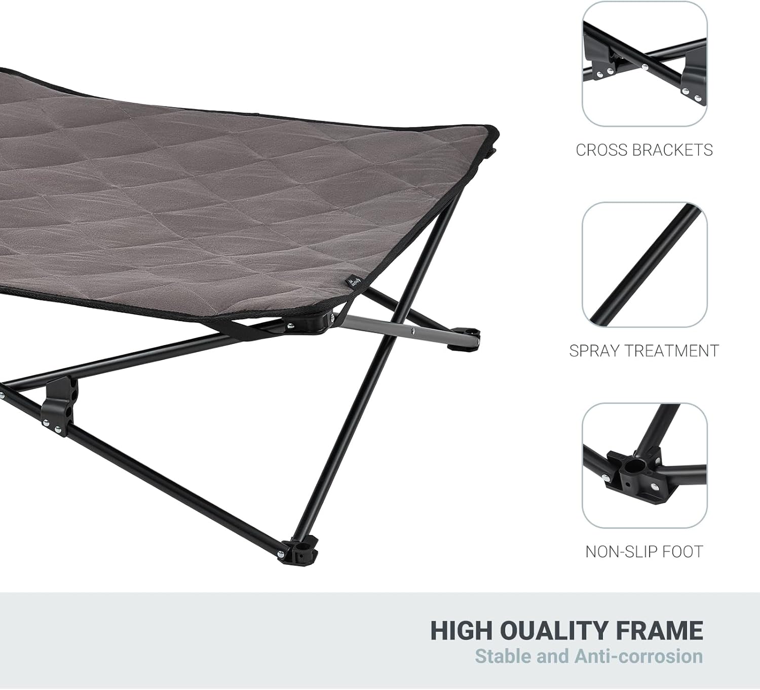 PORTABLE CAMPING DOG BED Easy to Clean-Easier to cleaner than traditional dog beds, you can simply wipe with a damp cloth for everyday cleaning or machine wash the cover for a deep clean or even use garden hose when necessary. Smooth mesh won’t catch hair, dirt and grime.